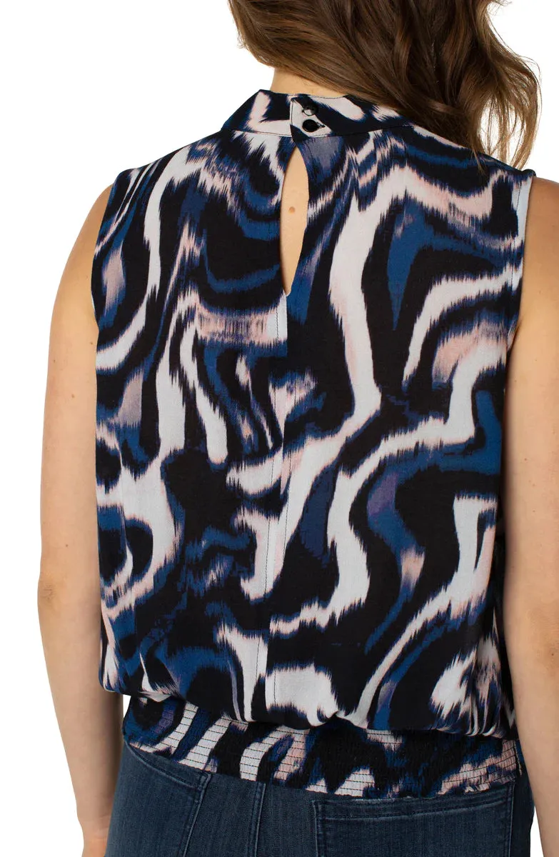 Nautical hues of blues black and whites mixed with soft pink brings a sense of coastal softness and calmness to the palette. This beautiful floating ink printed top is a fabulous statement piece featuring a mock neck slit and smocked waistband. Pair it with trousers for the perfect workwear event look or wear it out on the town with denim and heels for an elevated chic look!