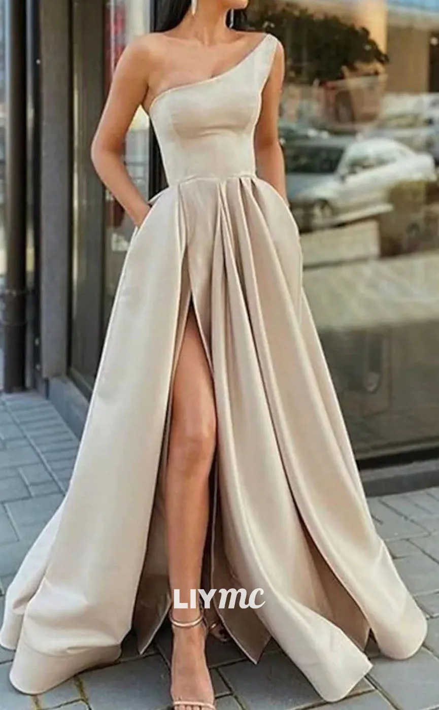 Effortlessly elegant and stylish, the LP1110 is a one shoulder satin gown perfect for formal events. Its A-line silhouette flatters all body types, while the pockets add functionality. Make a statement in this timeless and chic prom dress.
