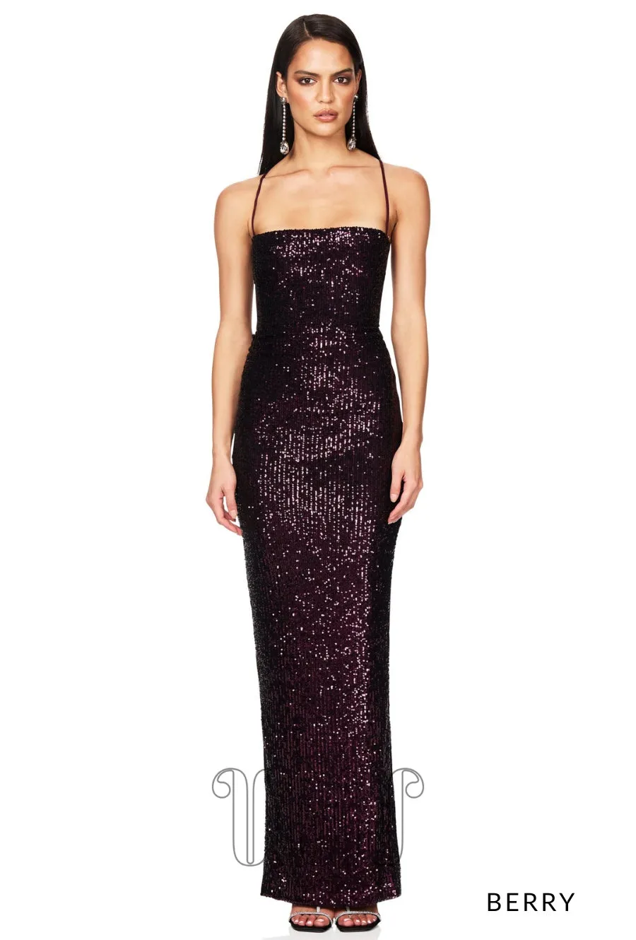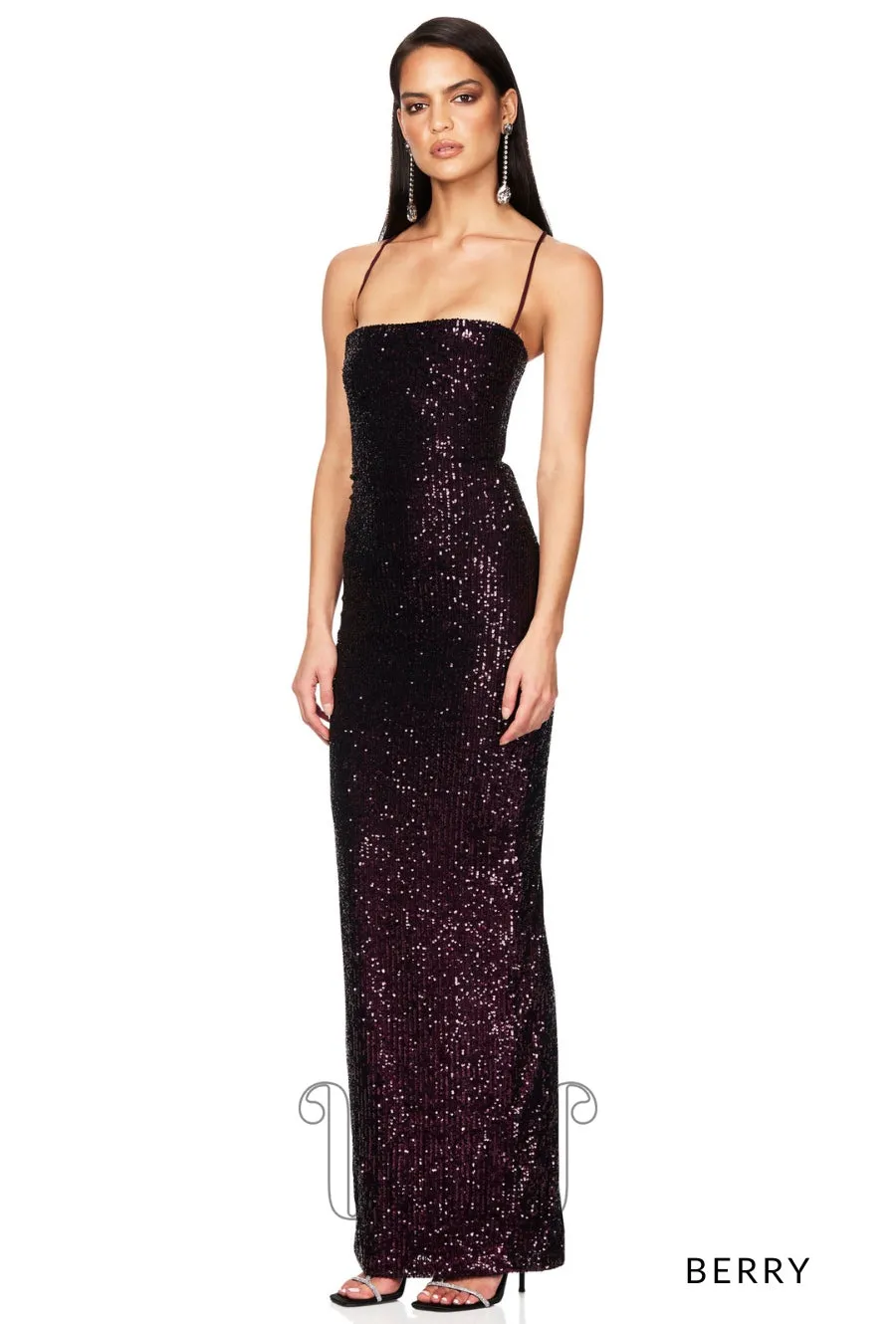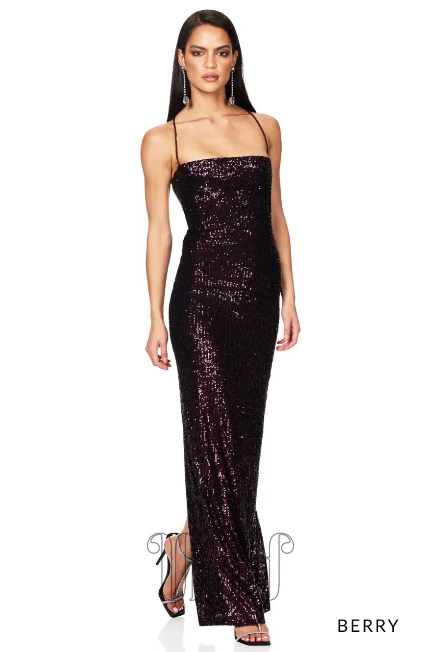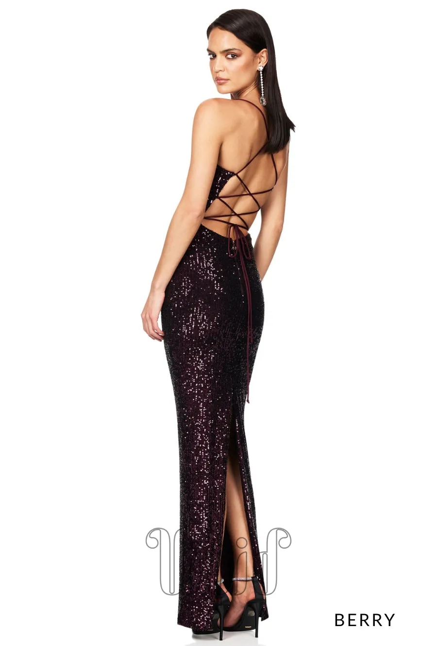 This decadent floor length design is crafted from a shimmering stretch sequin. The gown features a nipped waist, flattering side gathers and an exquisite lace up back. The gown is fully lined with a zip closure and split at the back hem for ease of wear.