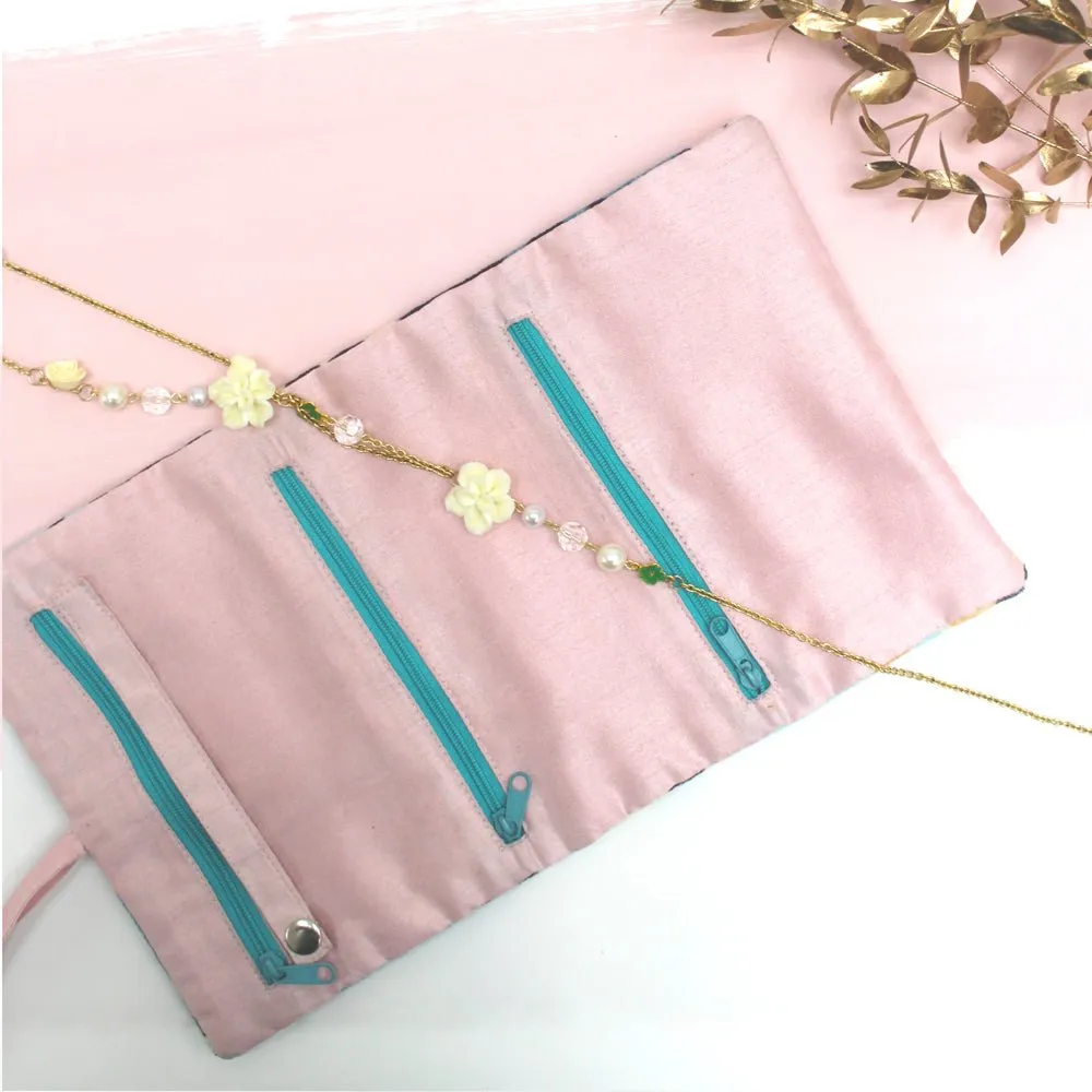 Inside: Features 3 zip pockets and a button up strap to hold earrings, bracelets or necklaces. 23 x 18.5cm (unrolled)