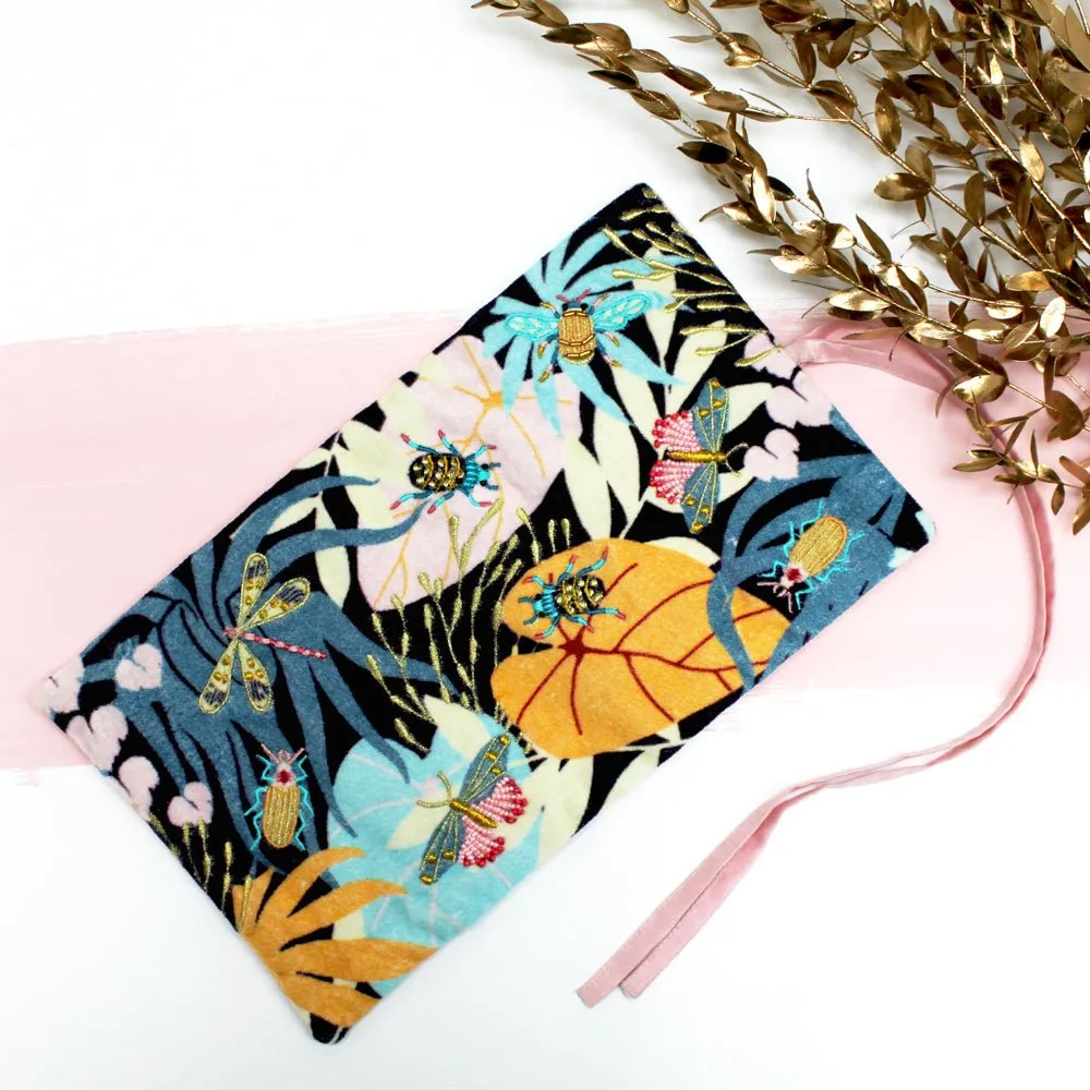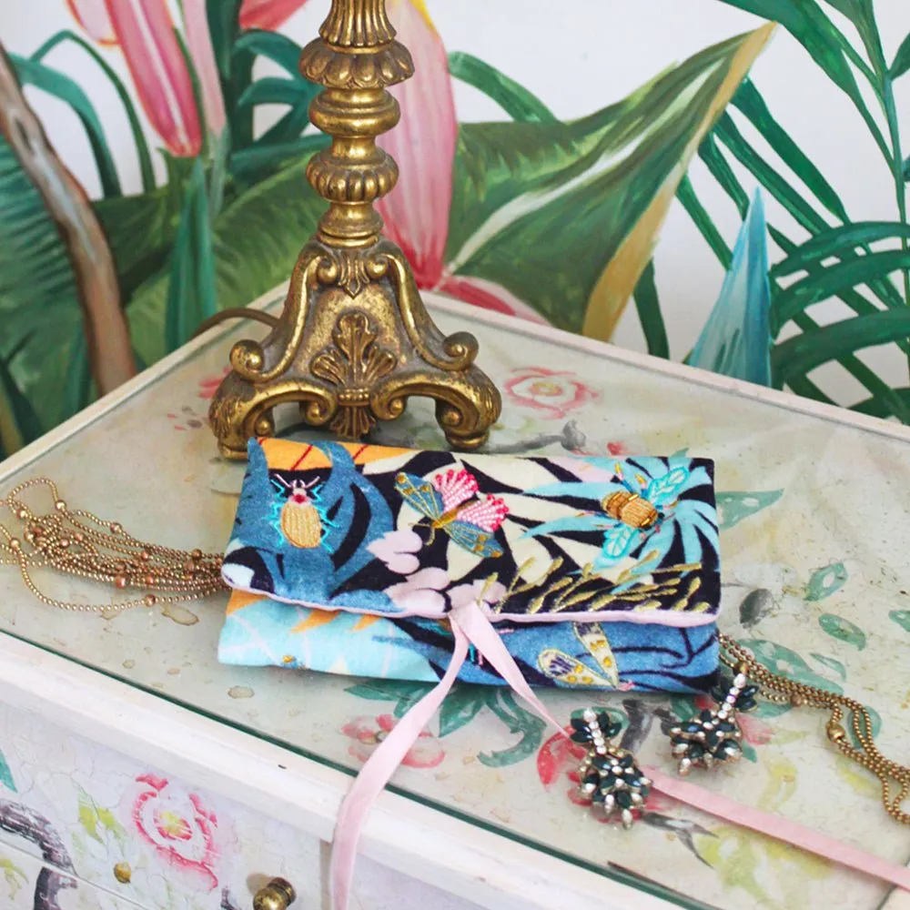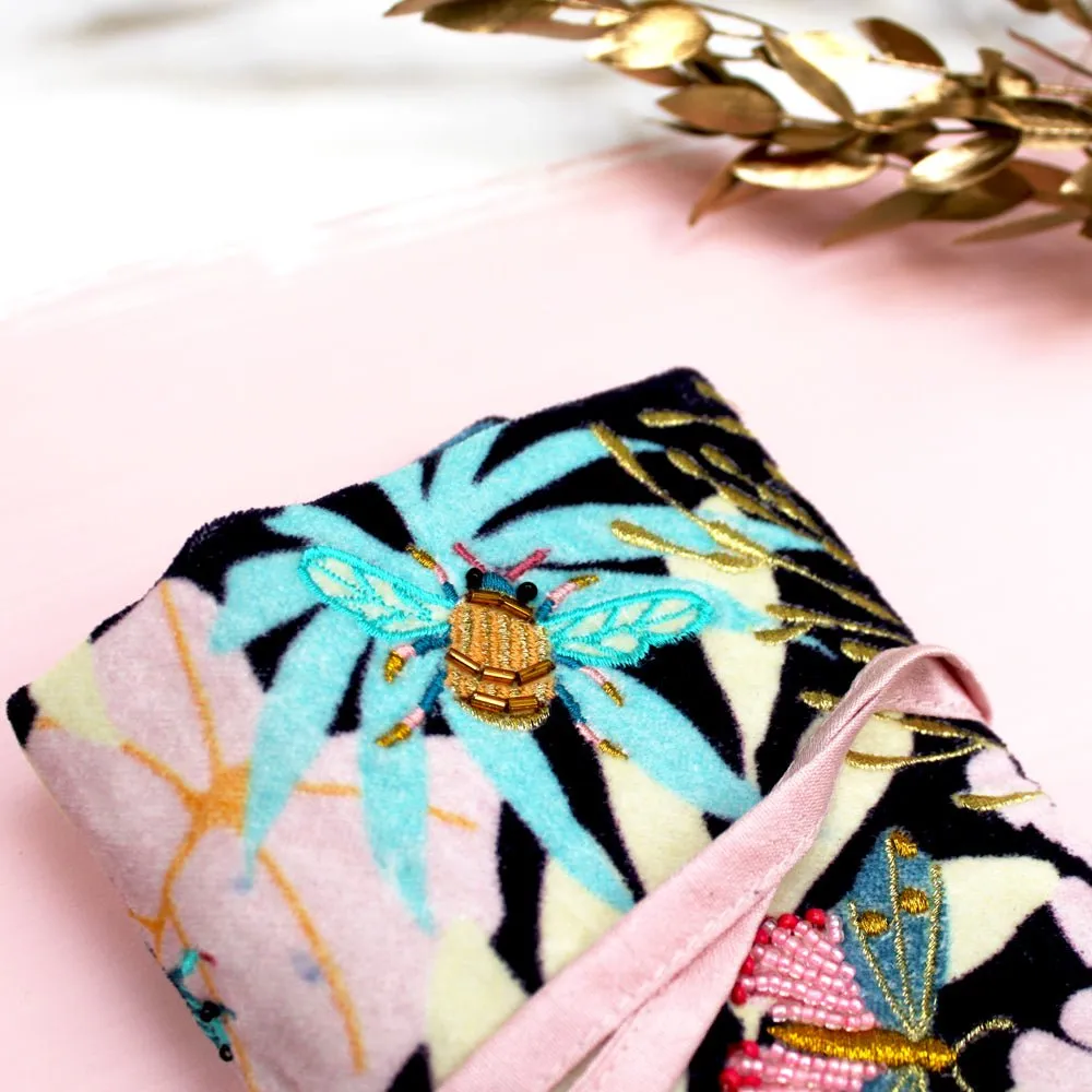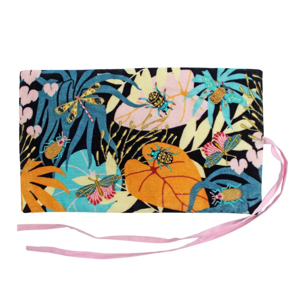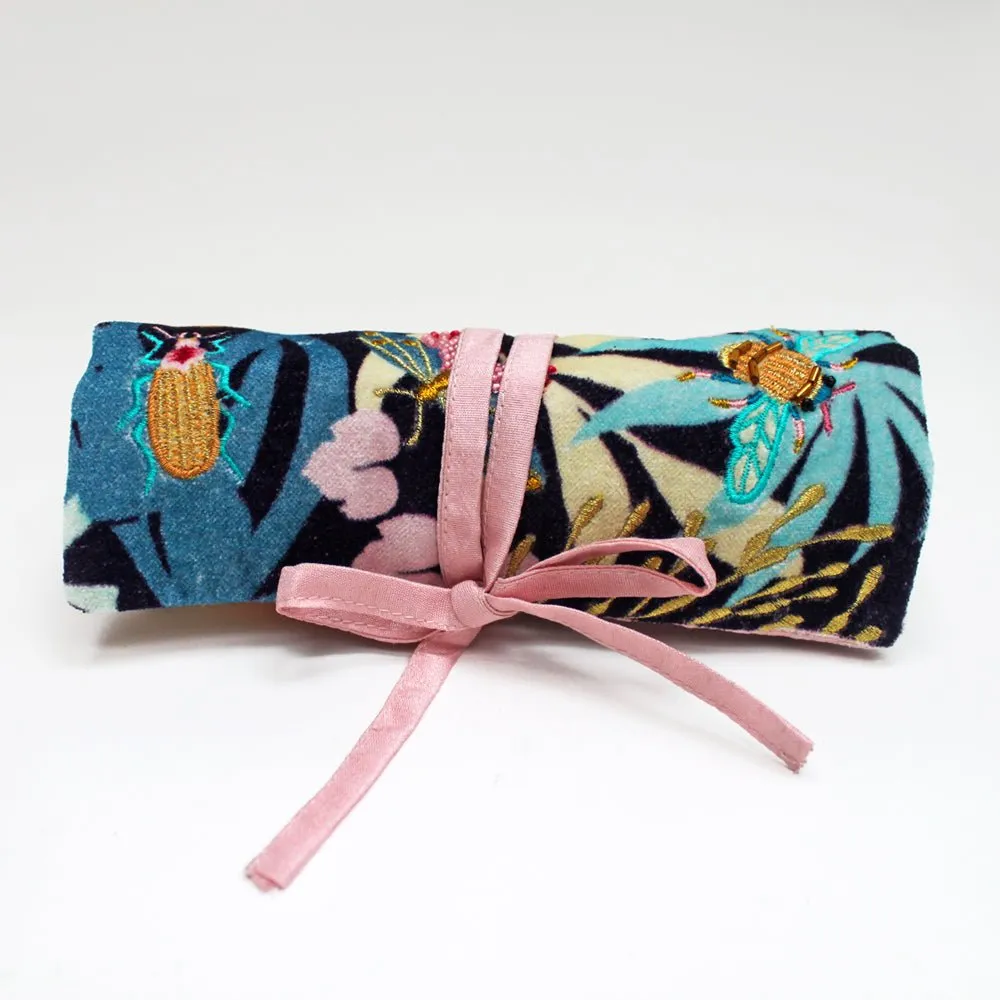 Features:Soft velvet jewellery roll featuring a printed leaf design with delicately embroidered, beaded insects. A stylish and handy travel accessory for keeping your gems and jewels organised.