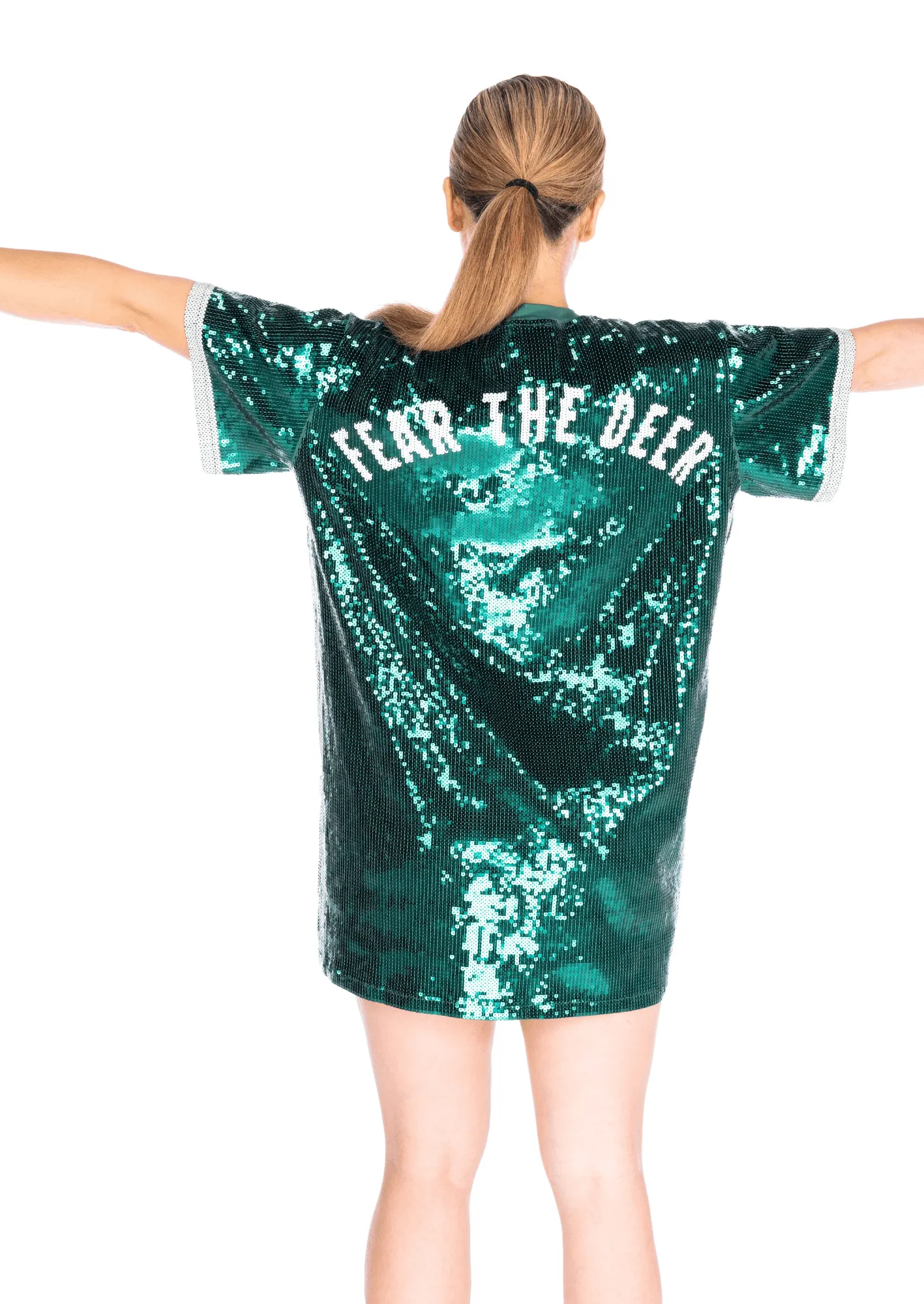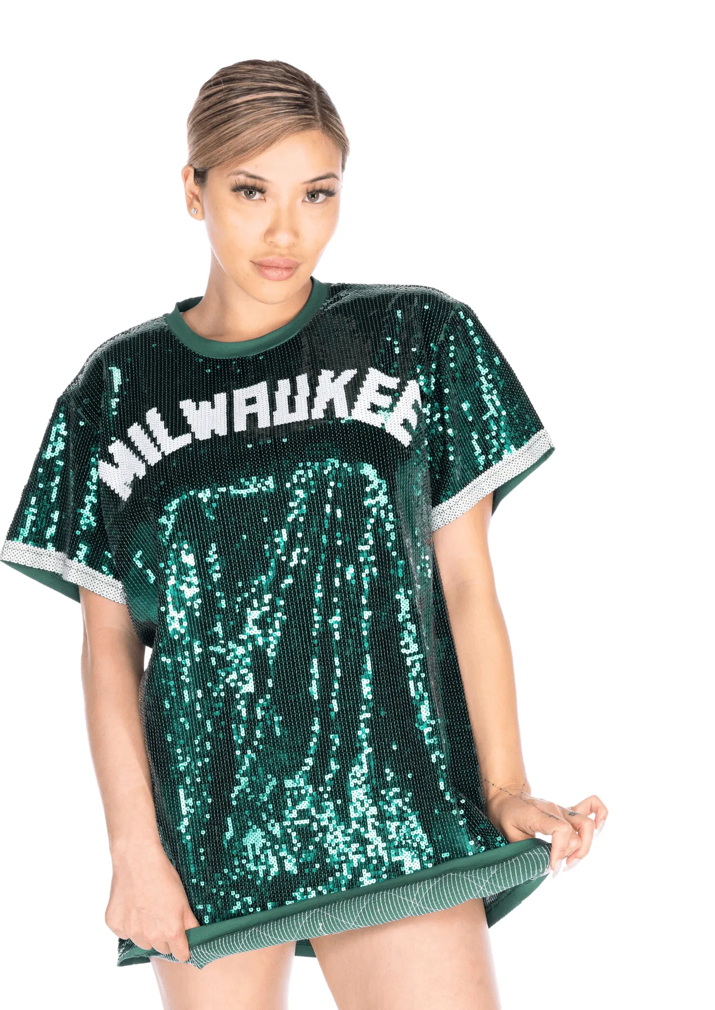 Designed by the Sequin Fans brand, this stunning Milwaukee Basketball Sequin Jersey Dress beautifully showcases your love for the Milwaukee Basketball team. Step into the stadium or into any game day party with confidence and style with this sports glam basketball jersey dress, perfect for parties that go from day to night.