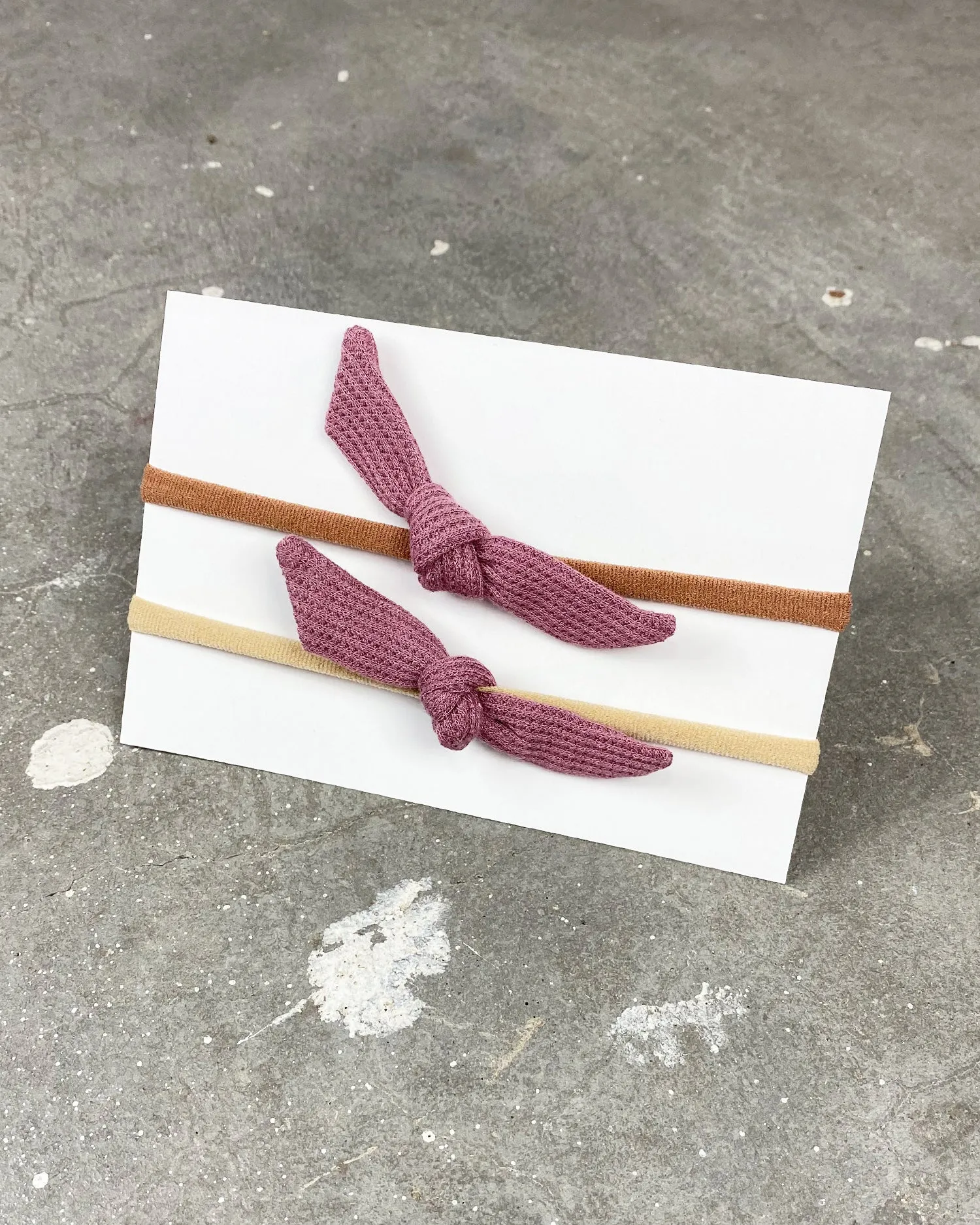 Sweet little mini bows on your color choice of stretchy nylon headband to best match your little one's hair or skin color. Can easily be untied and re-tied on elastics to grow with your child's hair styles.