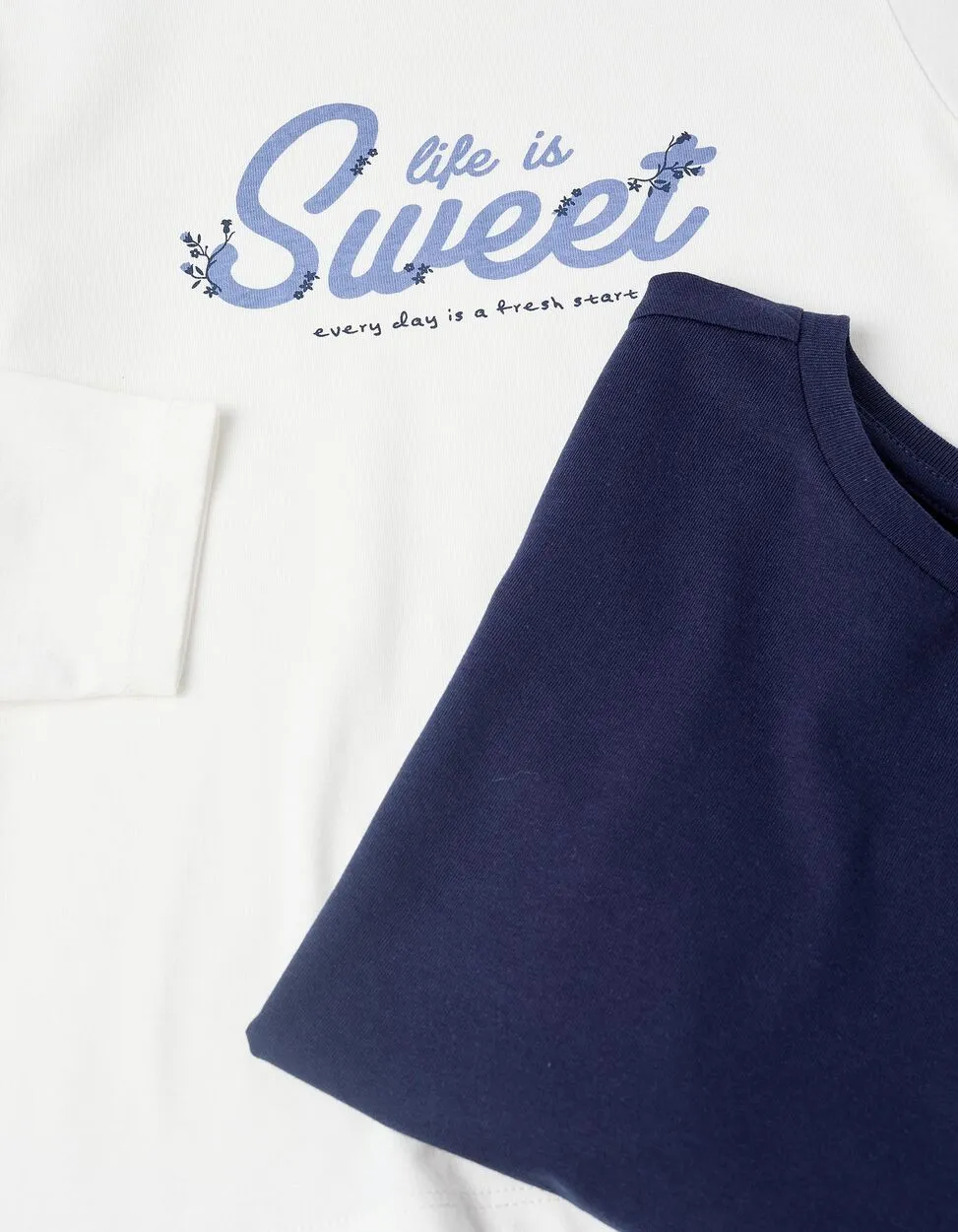 Pack of two pink long-sleeved t-shirts for girls, 100% cotton. Includes a plain dark blue t-shirt and a white one with a front print. Ribbed collar for easy dressing. Printed inner labels so as not to irritate the skin. An ideal set for everyday looks. We Care: item with Oeko-Tex Standard 100 certification, ensuring the absence of harmful or irritating substances for the skin.