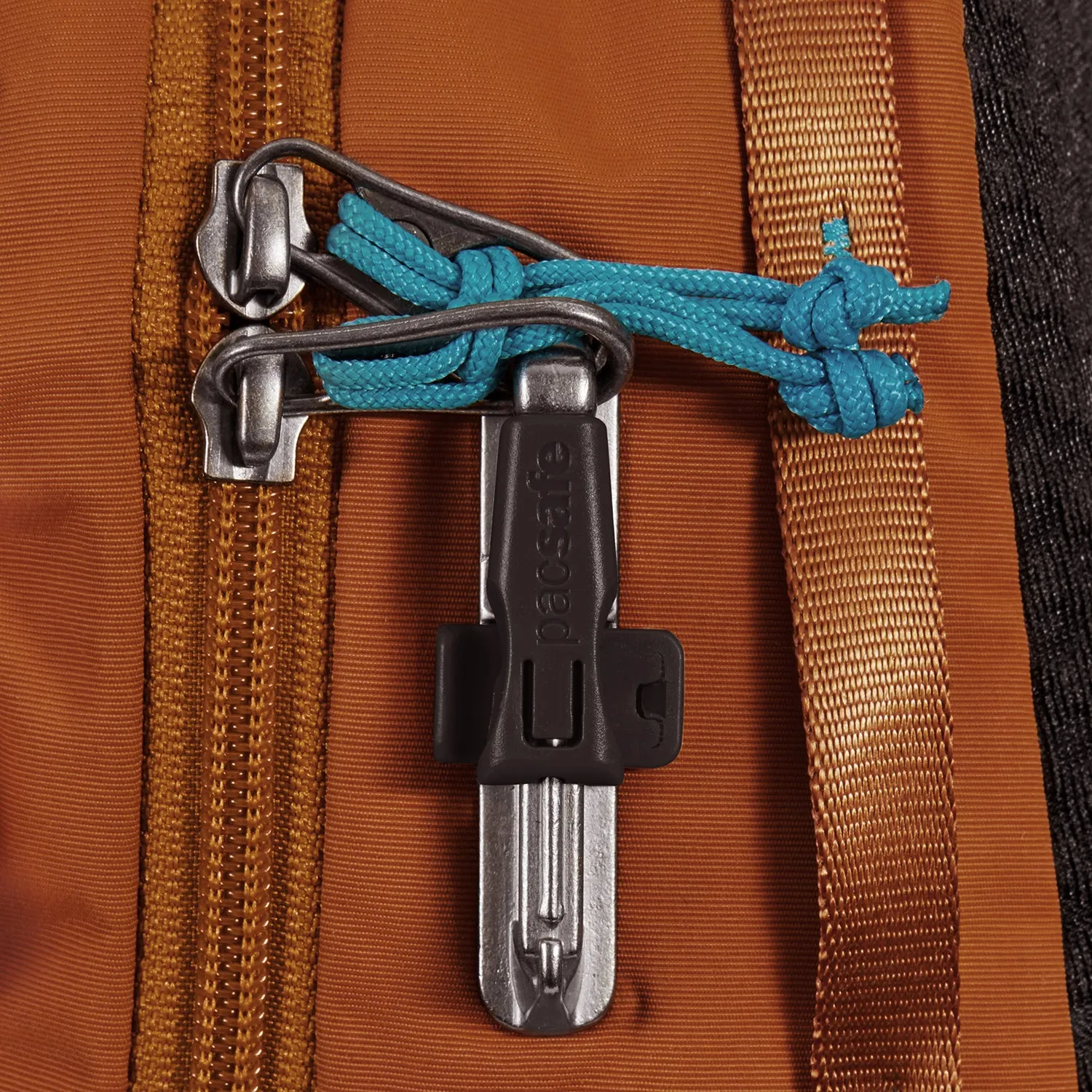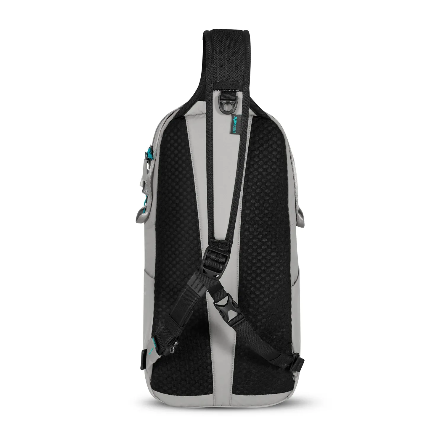 The Pacsafe Eco 12L Anti-theft Sling Backpack is part of Pacsafe's most sustainable collection, utilizing almost 100% recycled materials and components. This spacious sling pack is designed for outdoor activities, bike rides, and travel. The ergonomically-designed shoulder strap provides superior support and carrying comfort. It offers ample room to pack your essentials, including two water bottle pockets and a dedicated space for a water bladder. The ambidextrous design allows you to choose which side you prefer the shoulder strap to be on. For added stability during movement, you can connect the body strap to the shoulder strap using the three-point attachment. This backpack is made with 8 recycled plastic bottles, which were used in the lining, mesh, webbing, and labels. The outer shell fabric and certain buckles are made with ECONYL® regenerated nylon, derived from discarded fishing nets, fabric scraps, carpets, and industrial plastic.