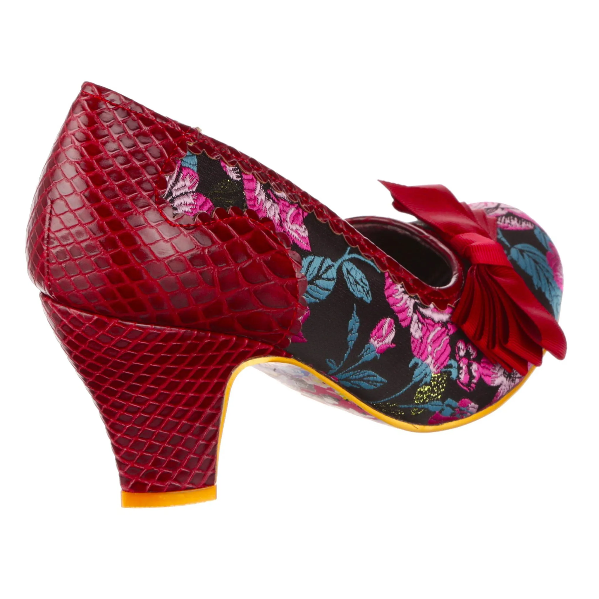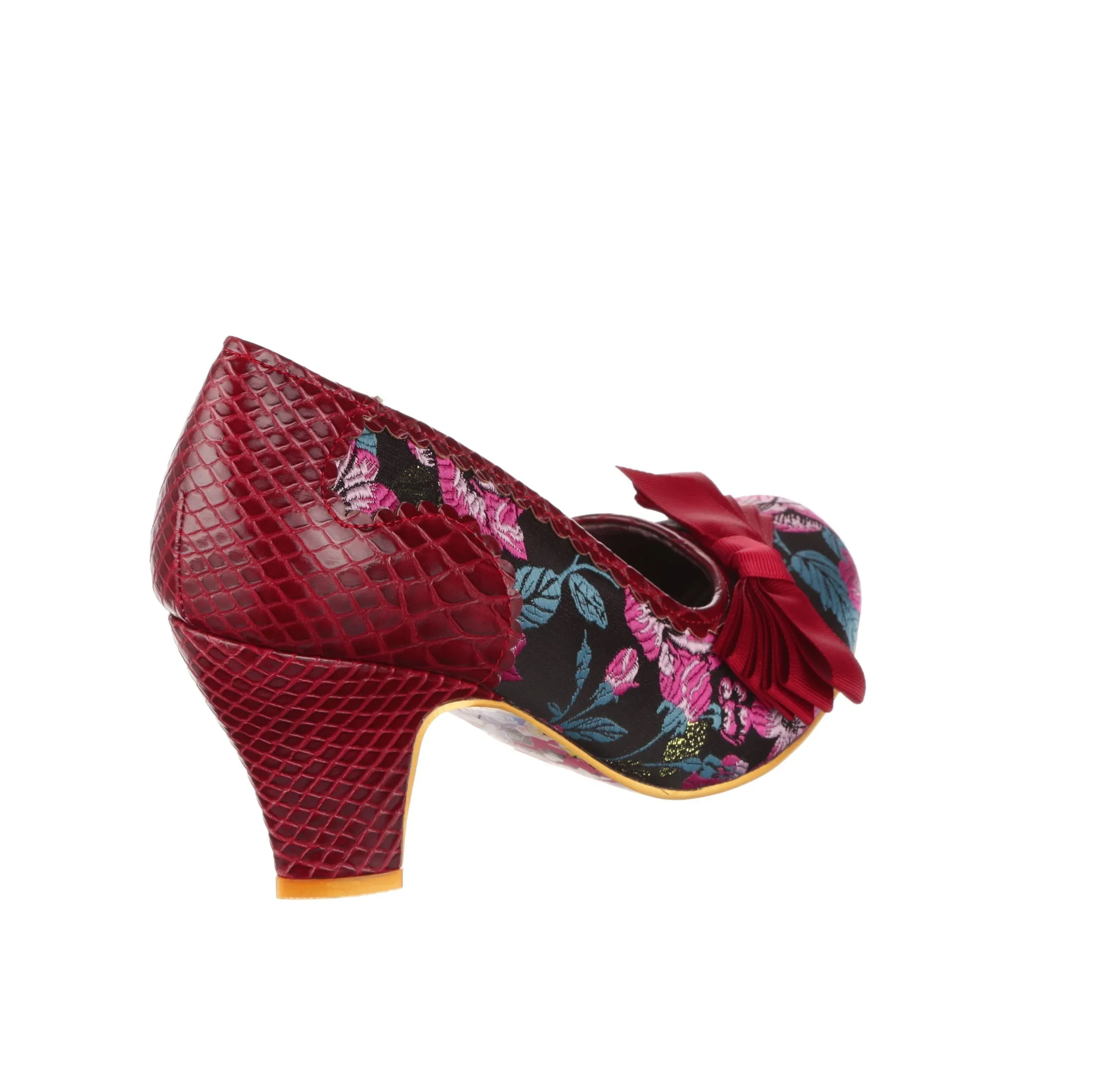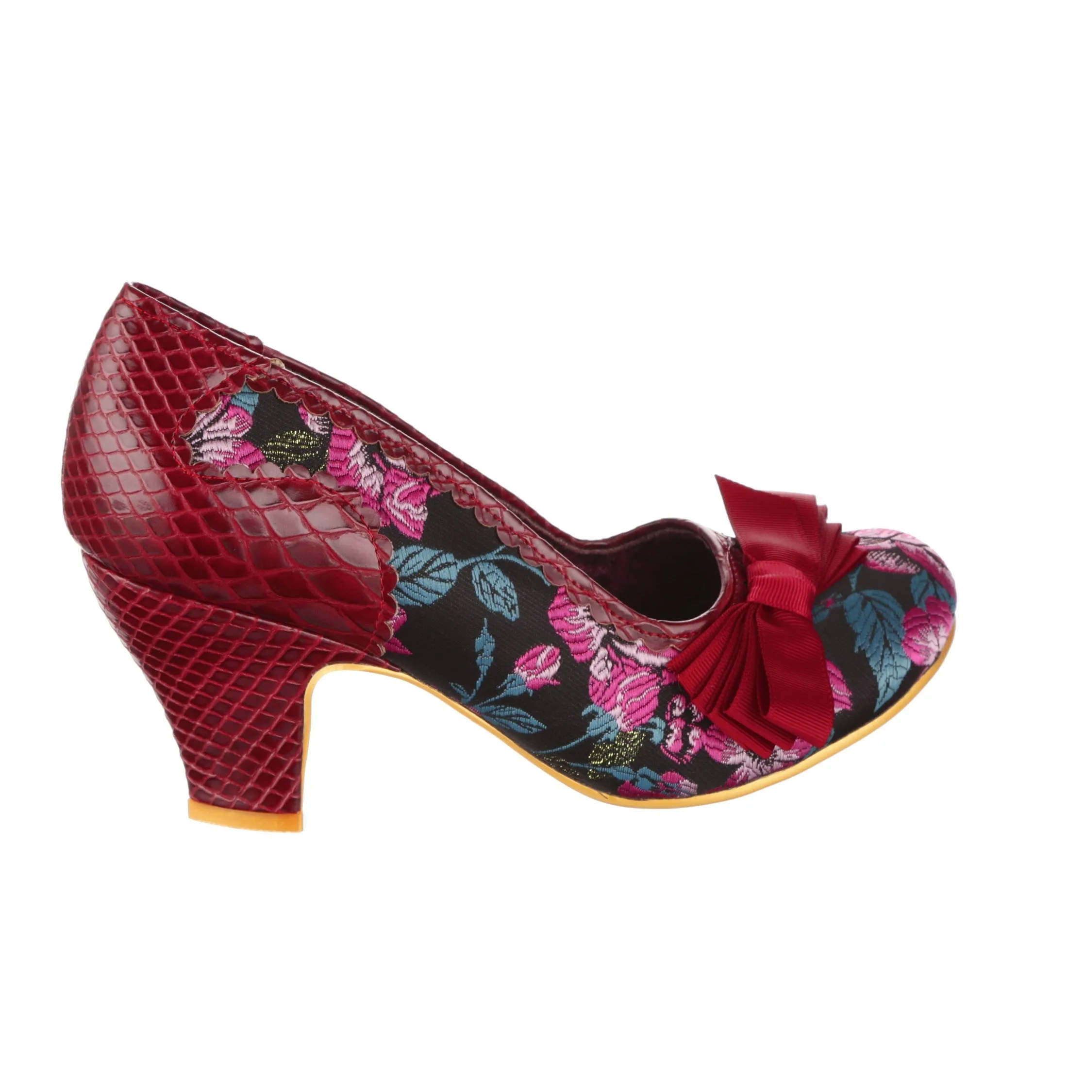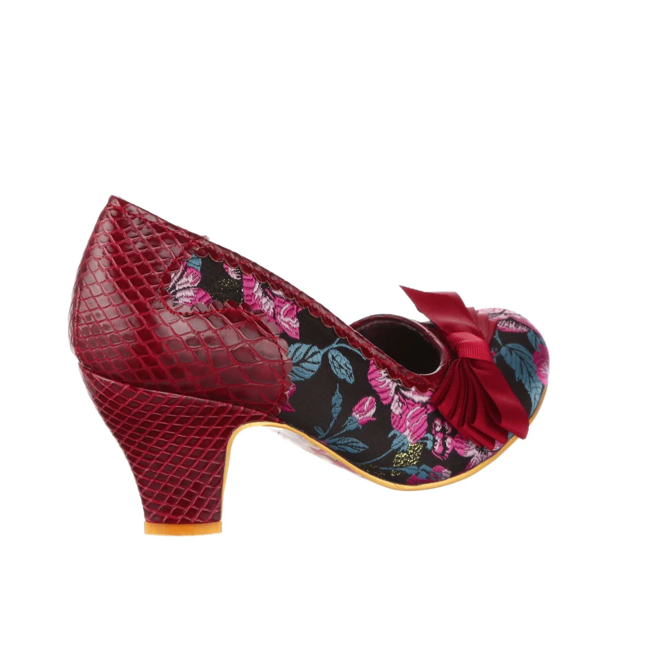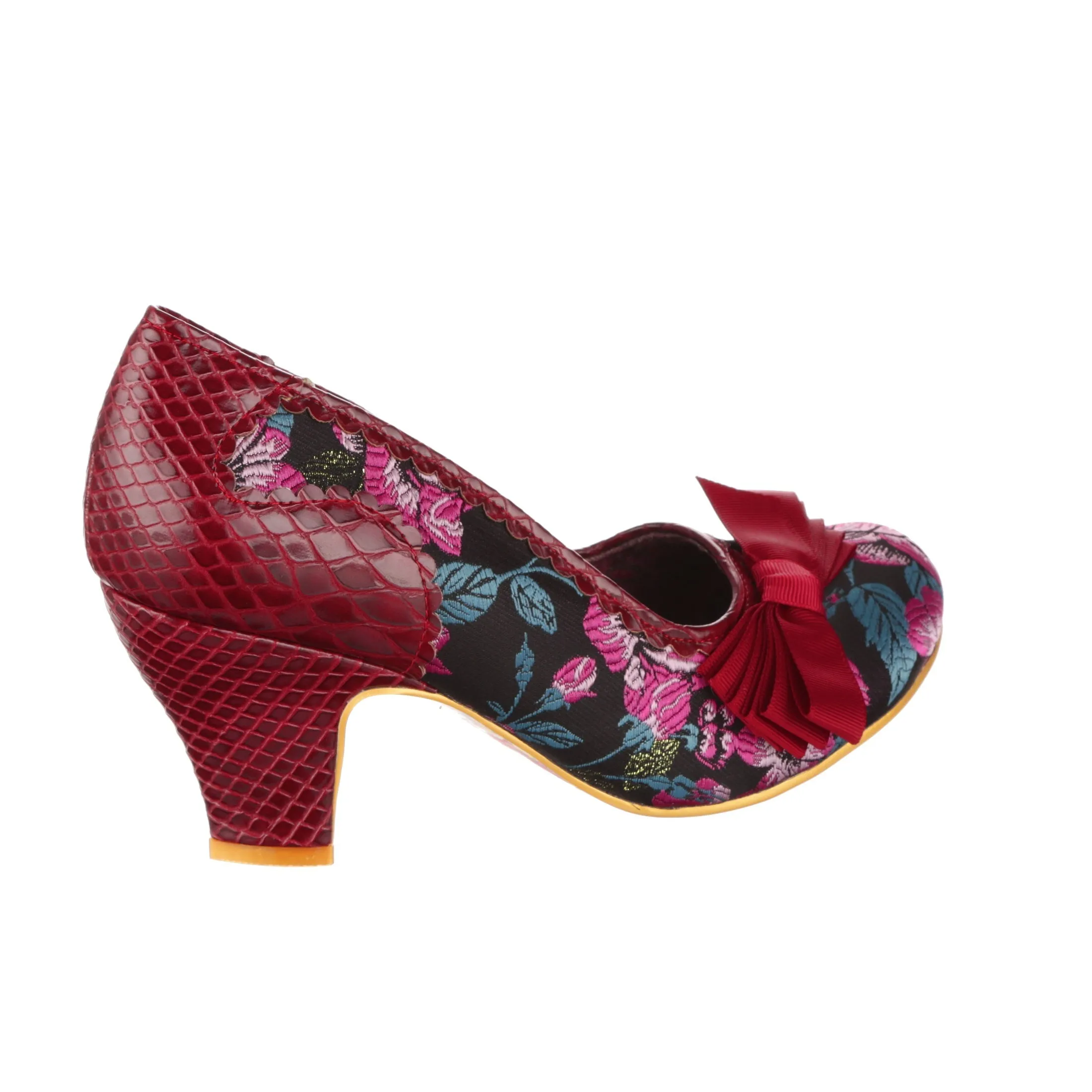 Add a dash of richness to your wardrobe with these fancy red floral mid heels! A luxe woven brocade fabric, patterened with pretty pink blossoms, is trimmed with a deep red snake print heel, scalloped edging and matching scarlet grosgrain bow. These comfy mid heeled courts will make you feel rich, rich, rich! wherever you are.