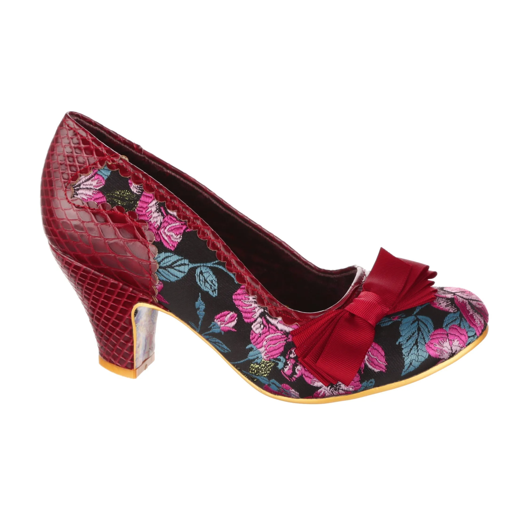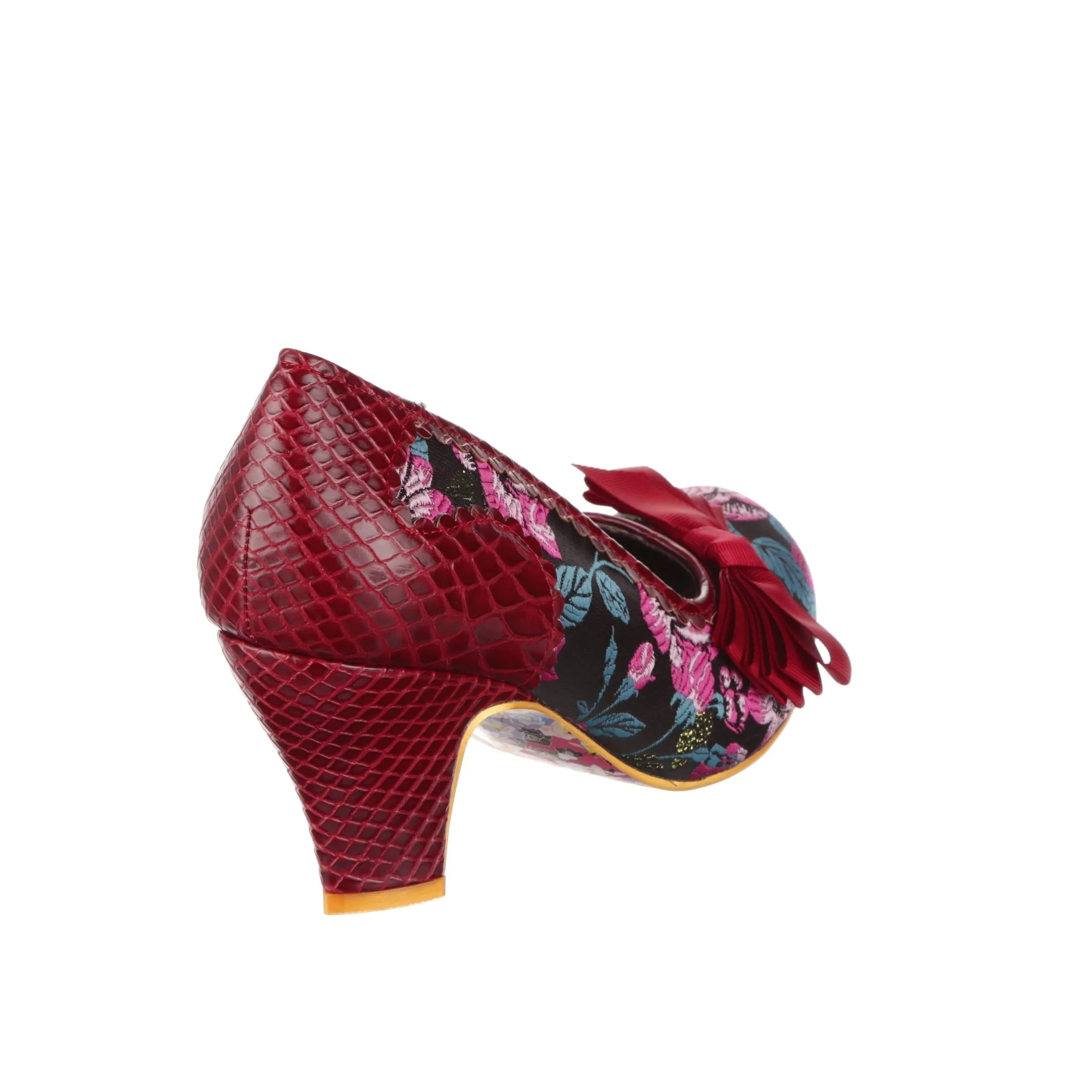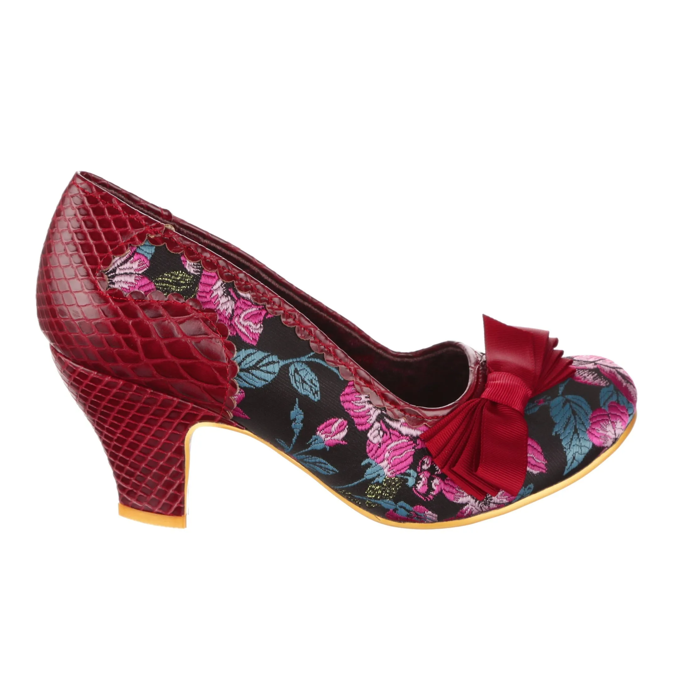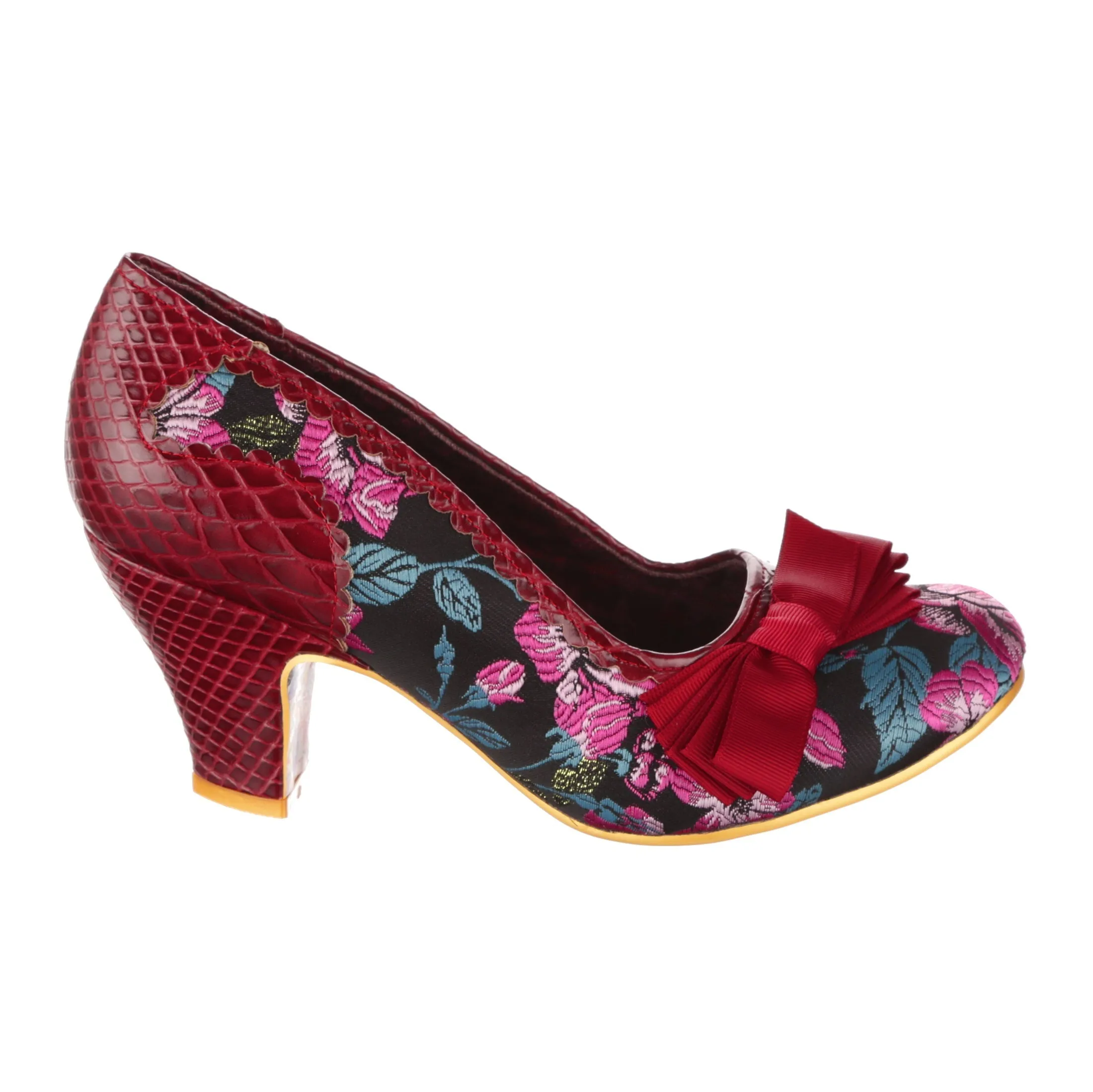 Add a dash of richness to your wardrobe with these fancy red floral mid heels! A luxe woven brocade fabric, patterened with pretty pink blossoms, is trimmed with a deep red snake print heel, scalloped edging and matching scarlet grosgrain bow. These comfy mid heeled courts will make you feel rich, rich, rich! wherever you are.
