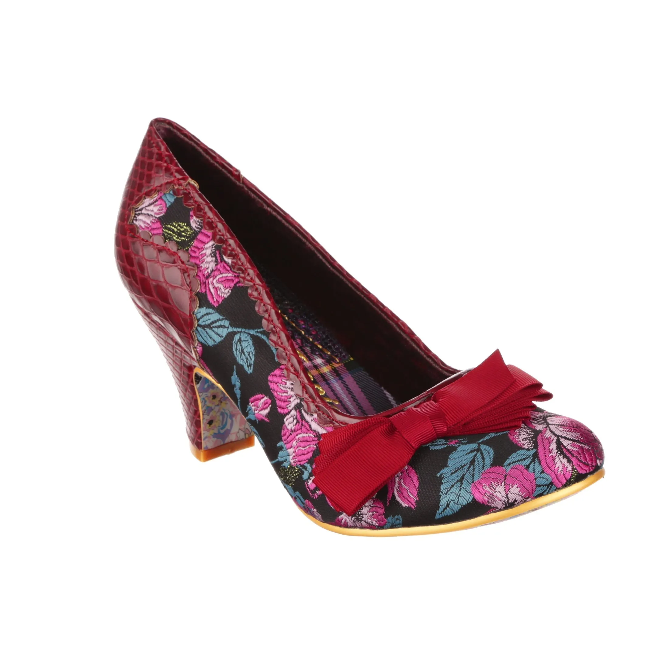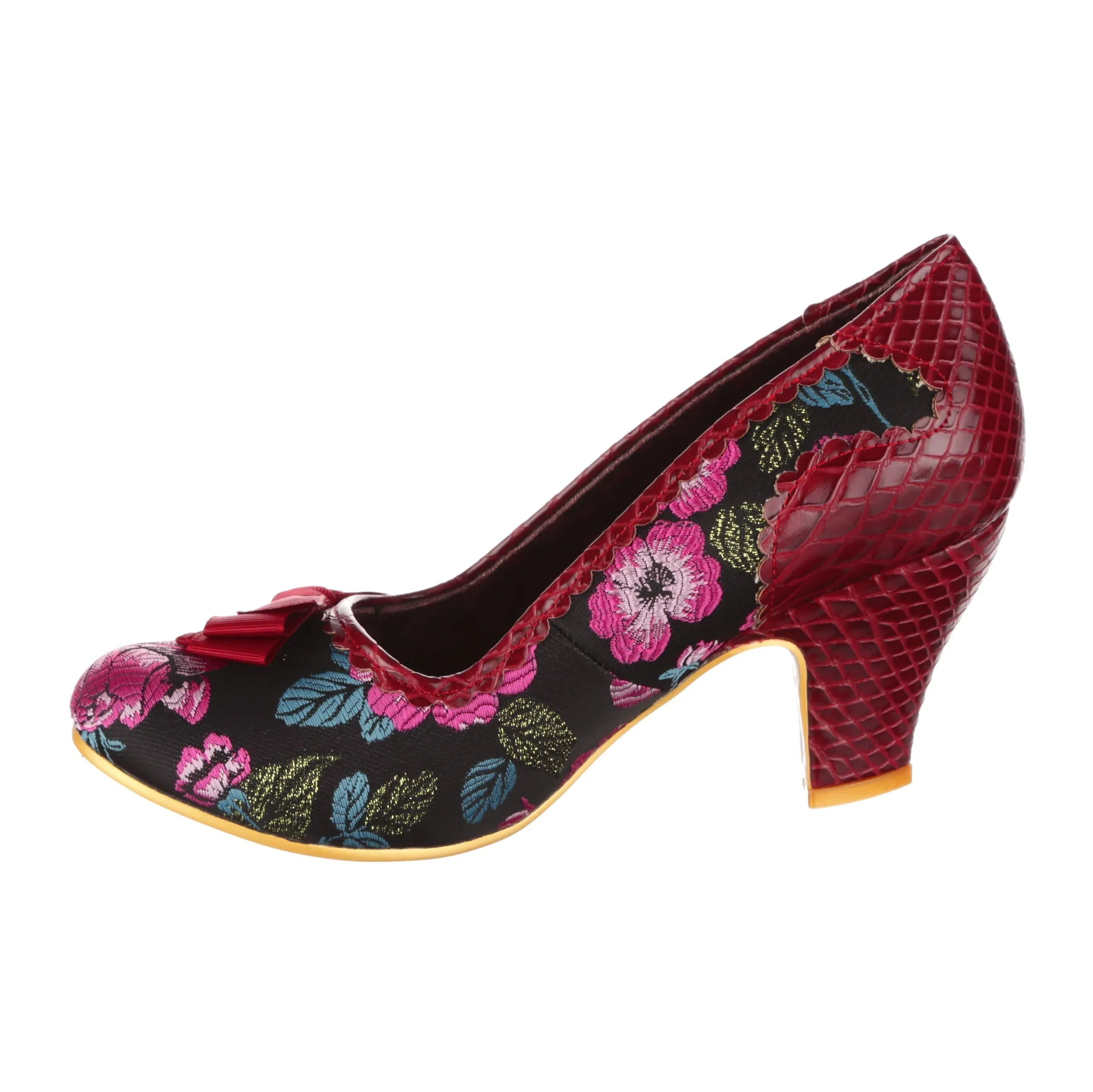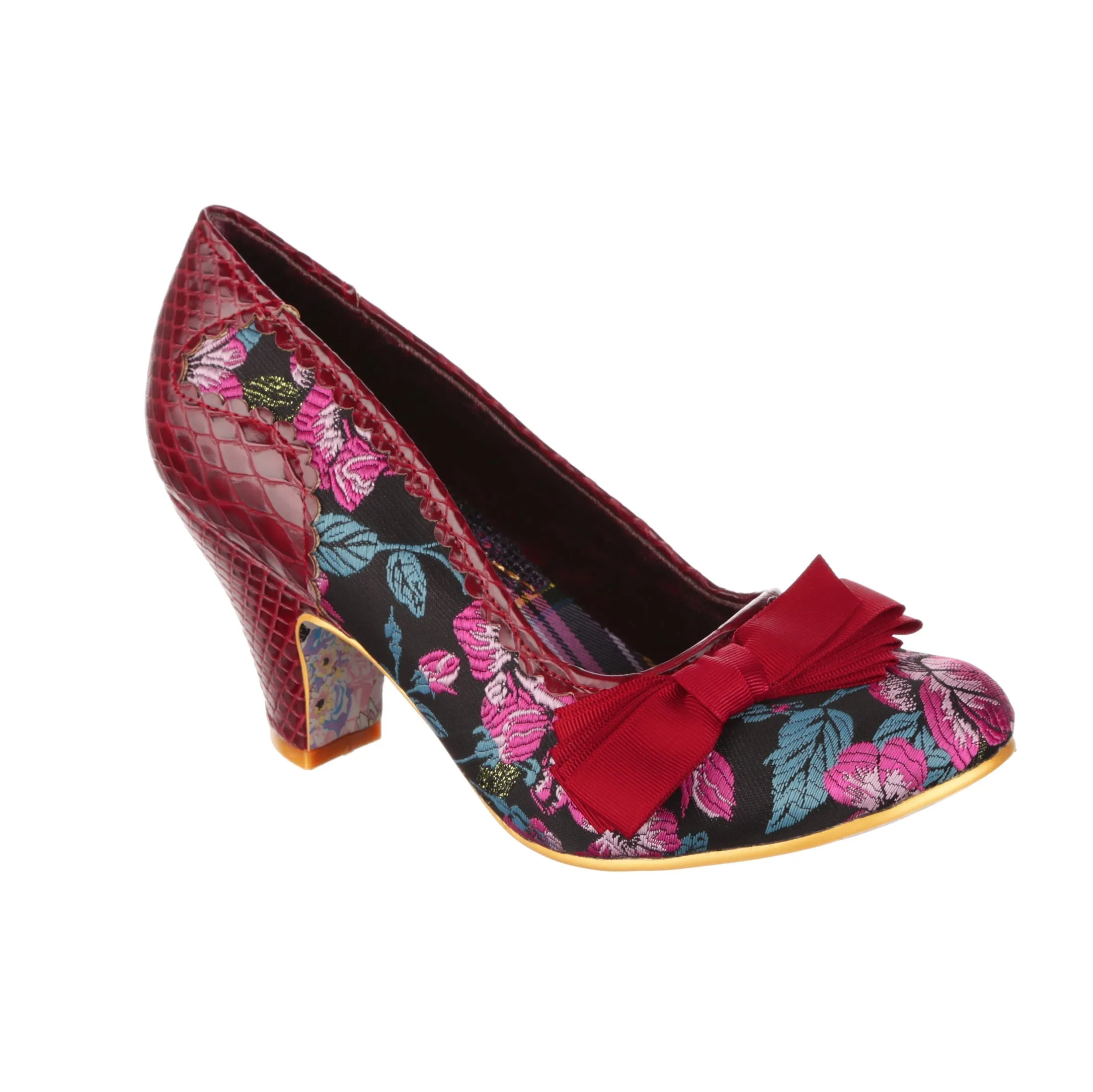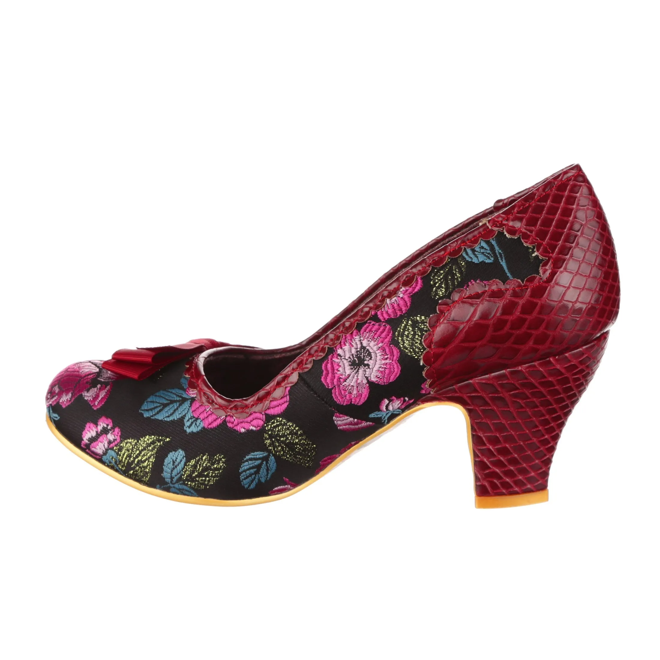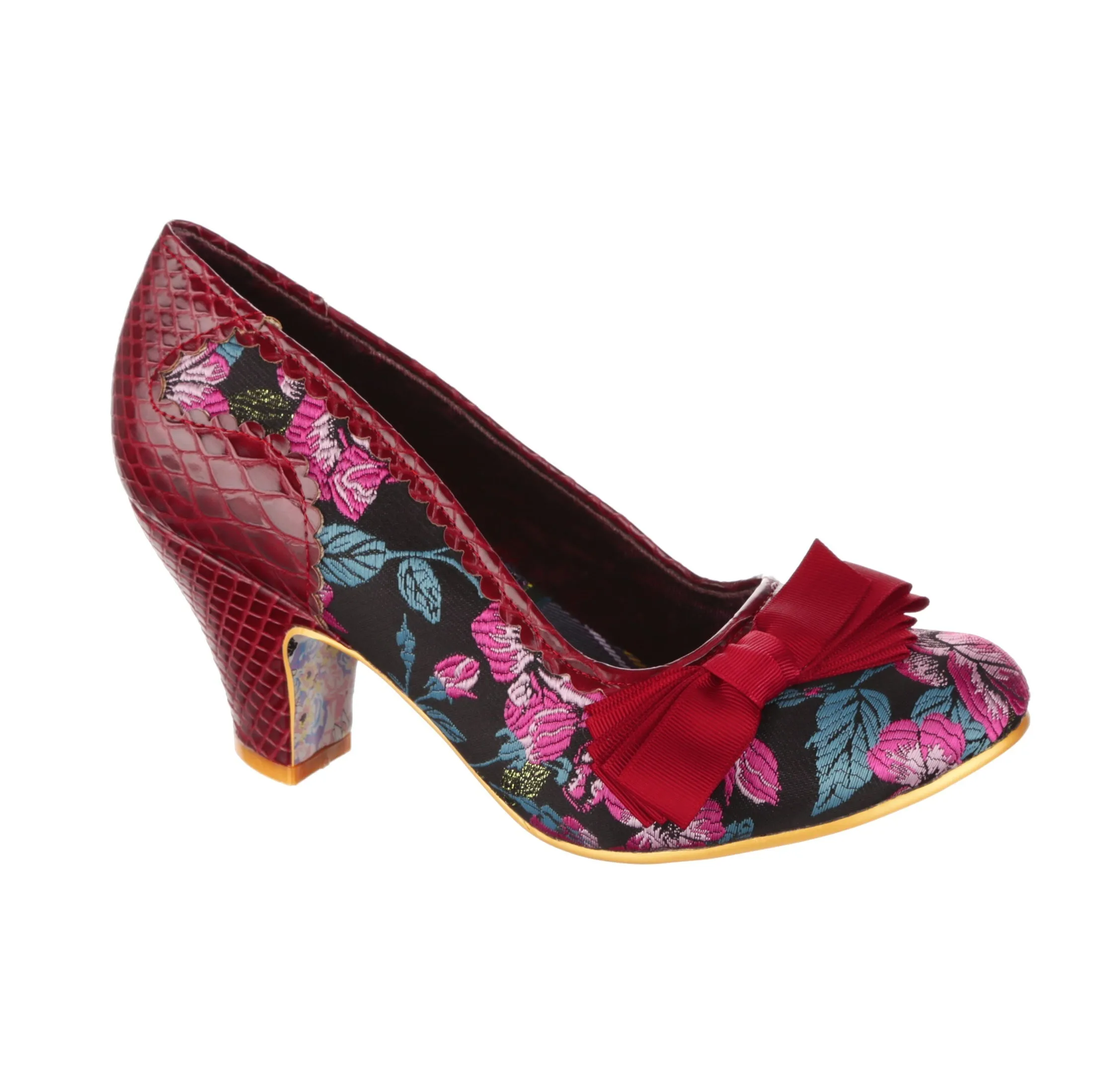 Add a dash of richness to your wardrobe with these fancy red floral mid heels! A luxe woven brocade fabric, patterened with pretty pink blossoms, is trimmed with a deep red snake print heel, scalloped edging and matching scarlet grosgrain bow. These comfy mid heeled courts will make you feel rich, rich, rich! wherever you are.