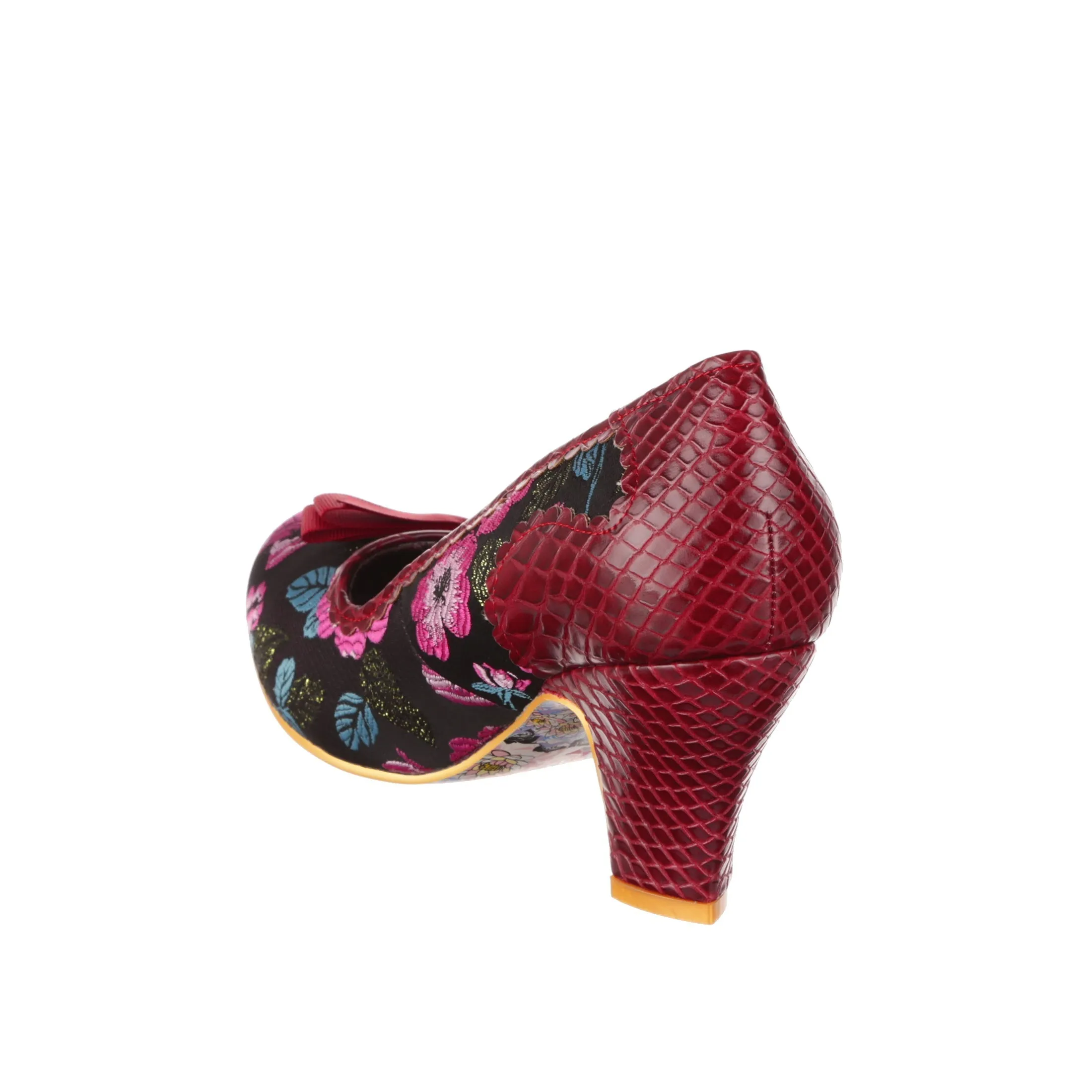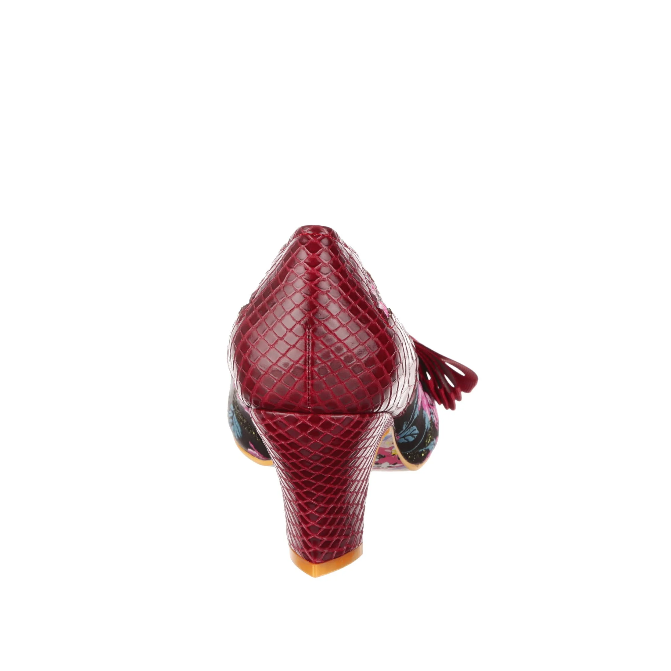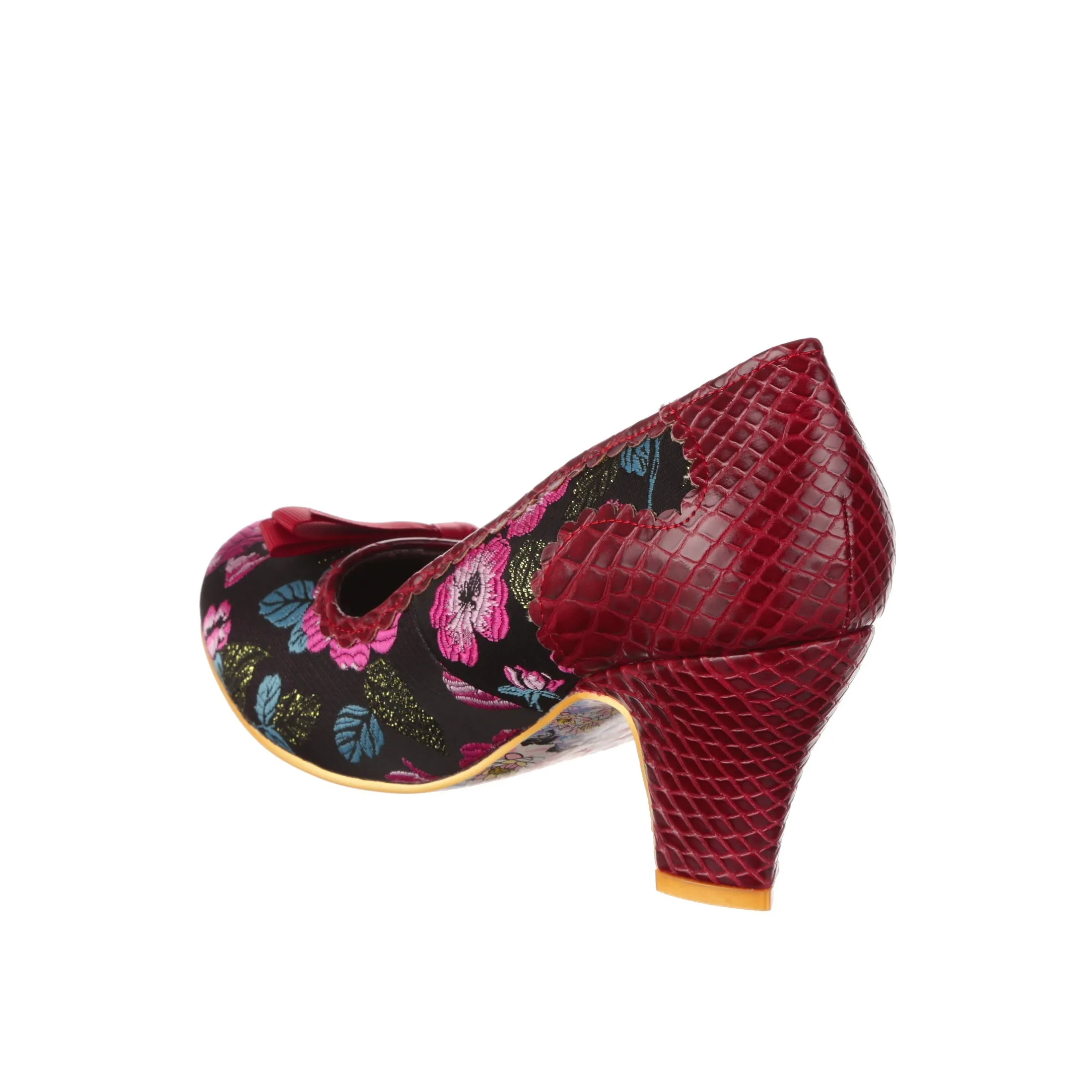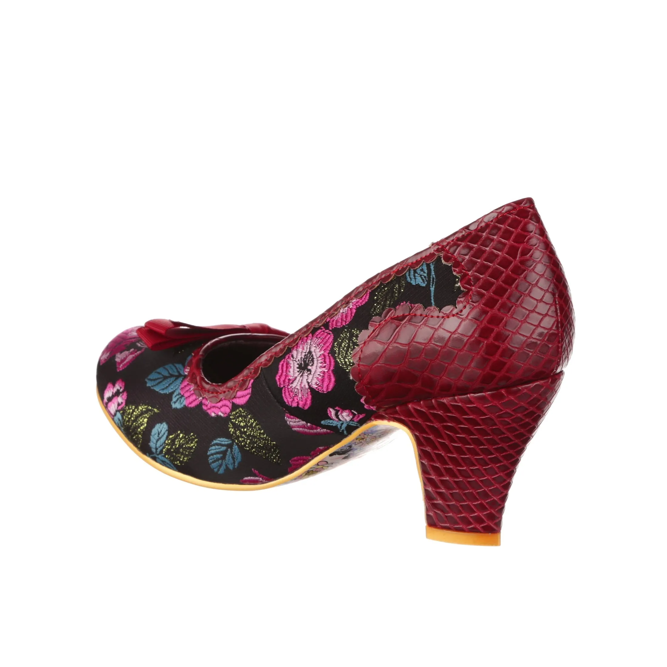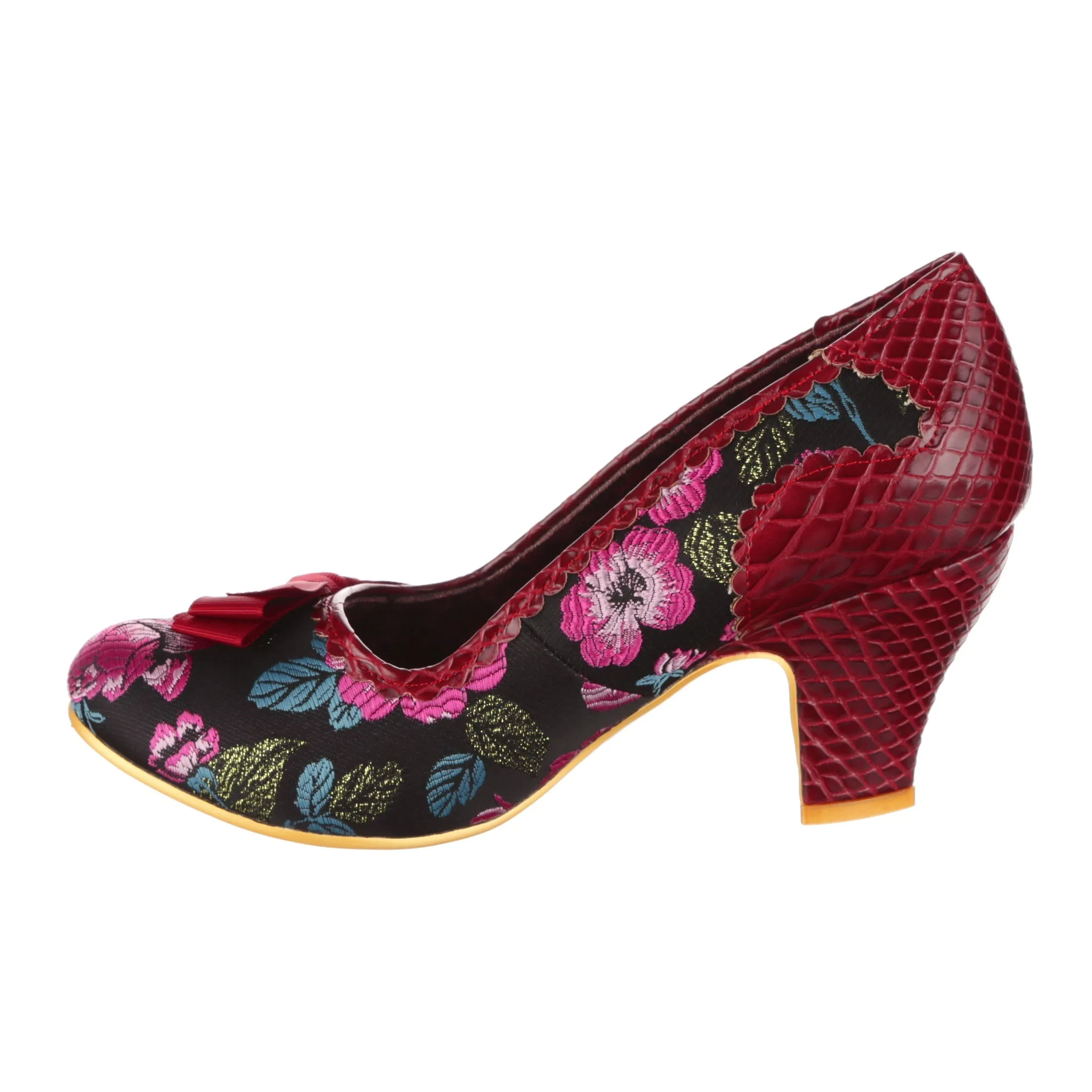 Add a dash of richness to your wardrobe with these fancy red floral mid heels! A luxe woven brocade fabric, patterened with pretty pink blossoms, is trimmed with a deep red snake print heel, scalloped edging and matching scarlet grosgrain bow. These comfy mid heeled courts will make you feel rich, rich, rich! wherever you are.
