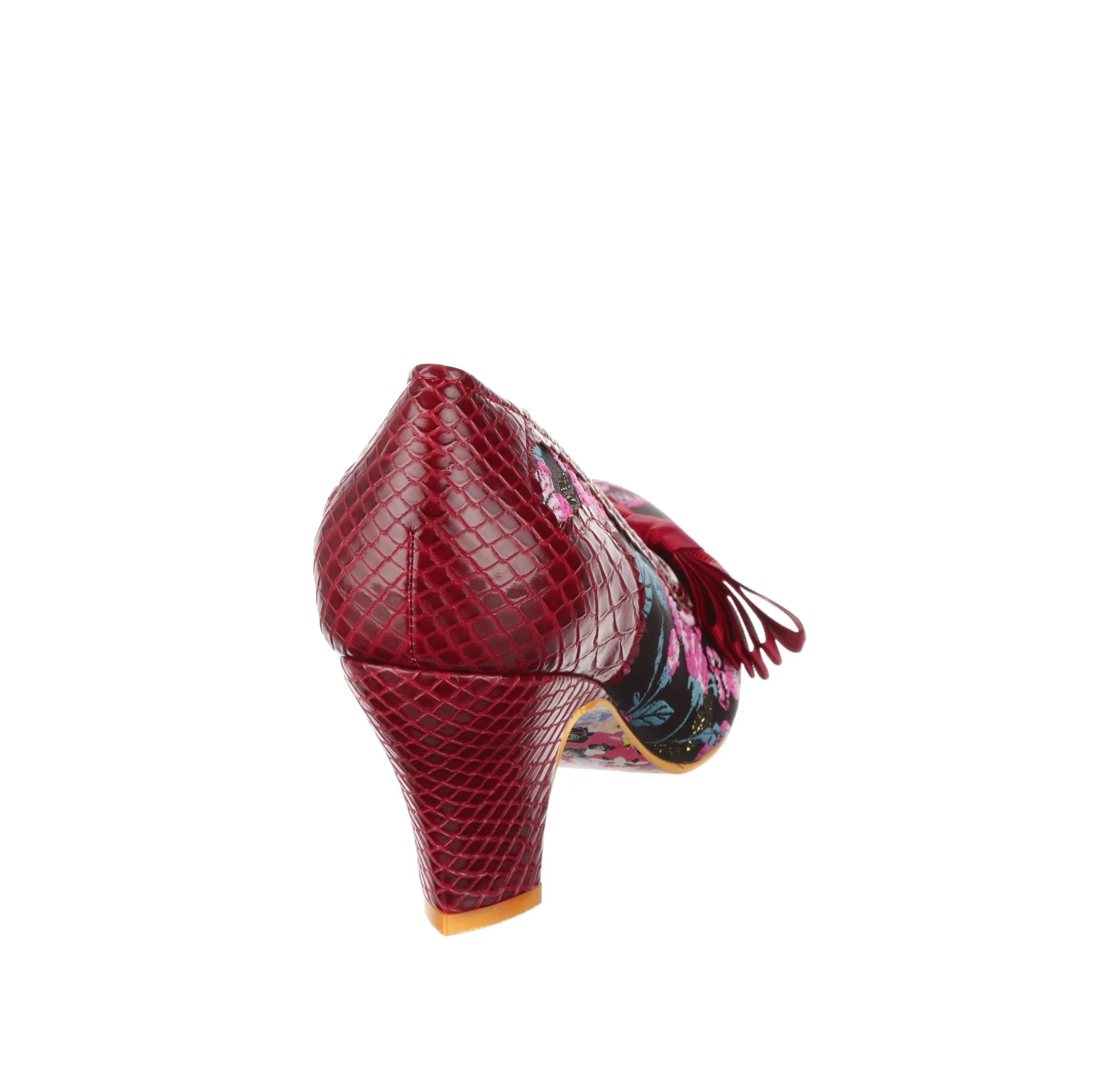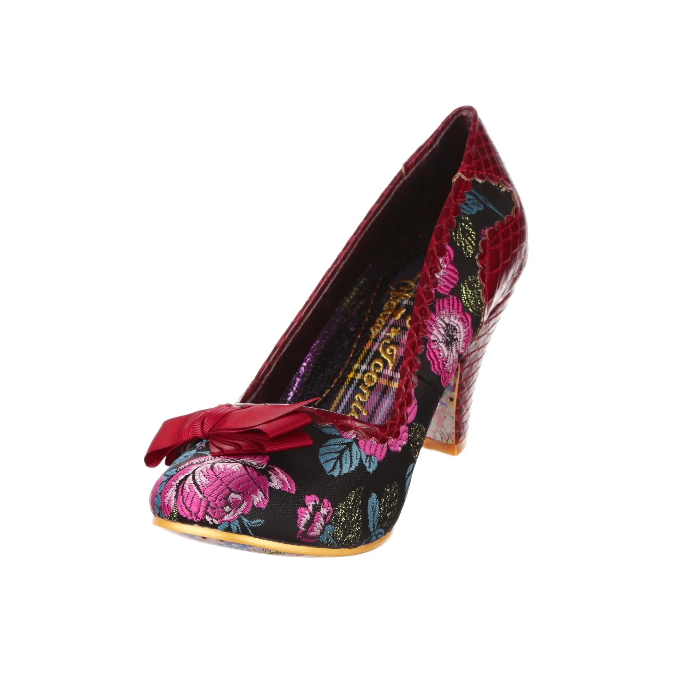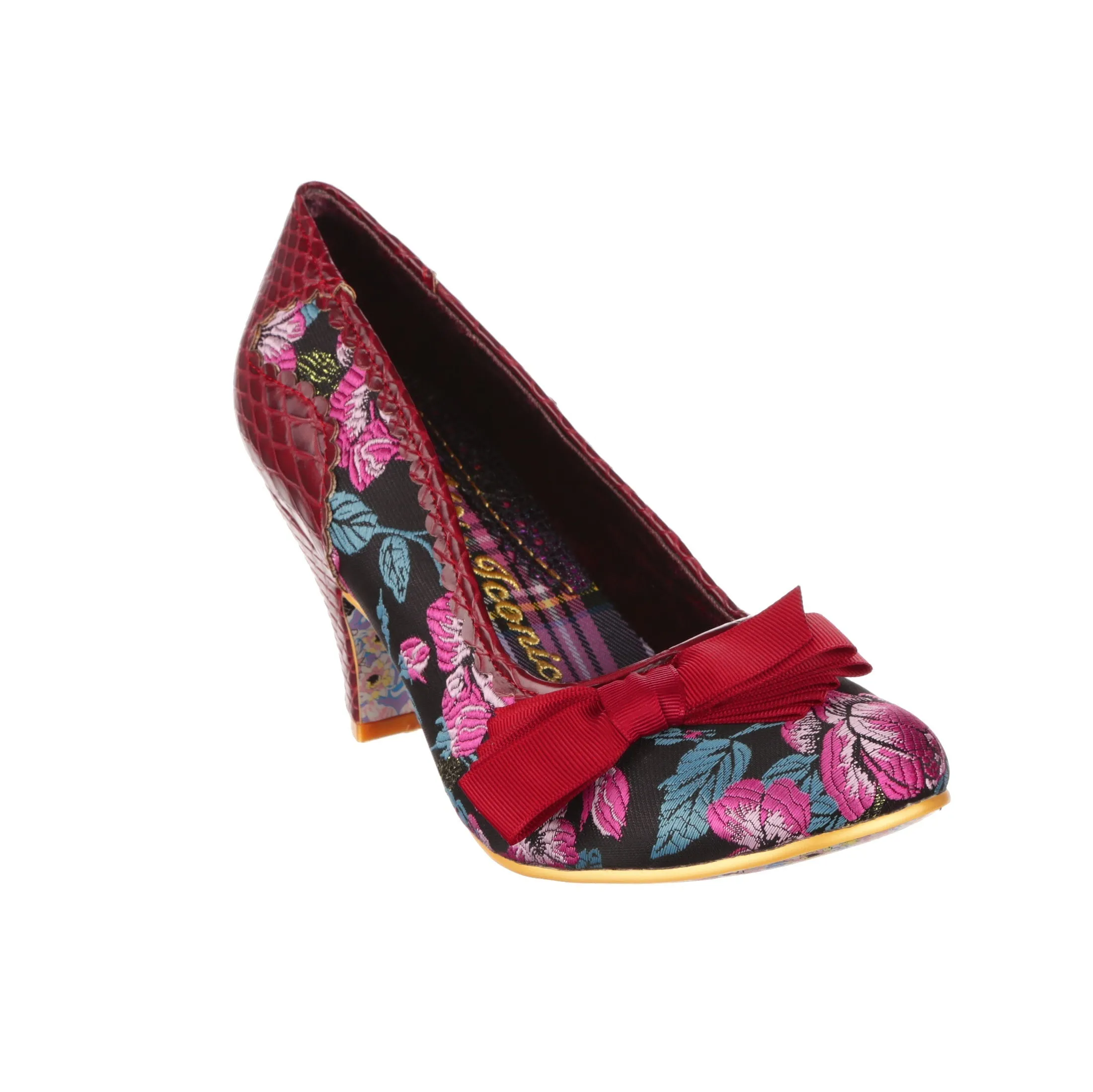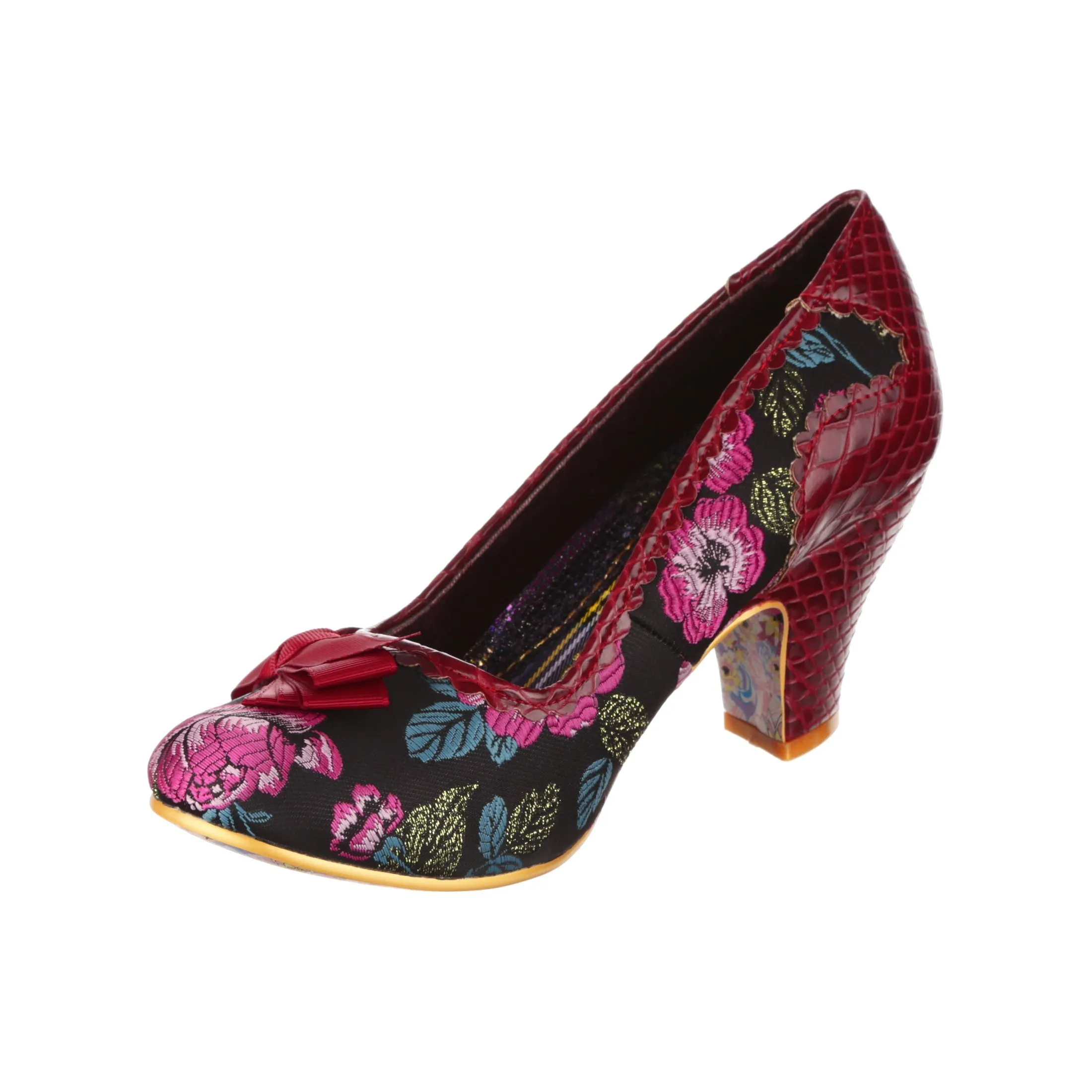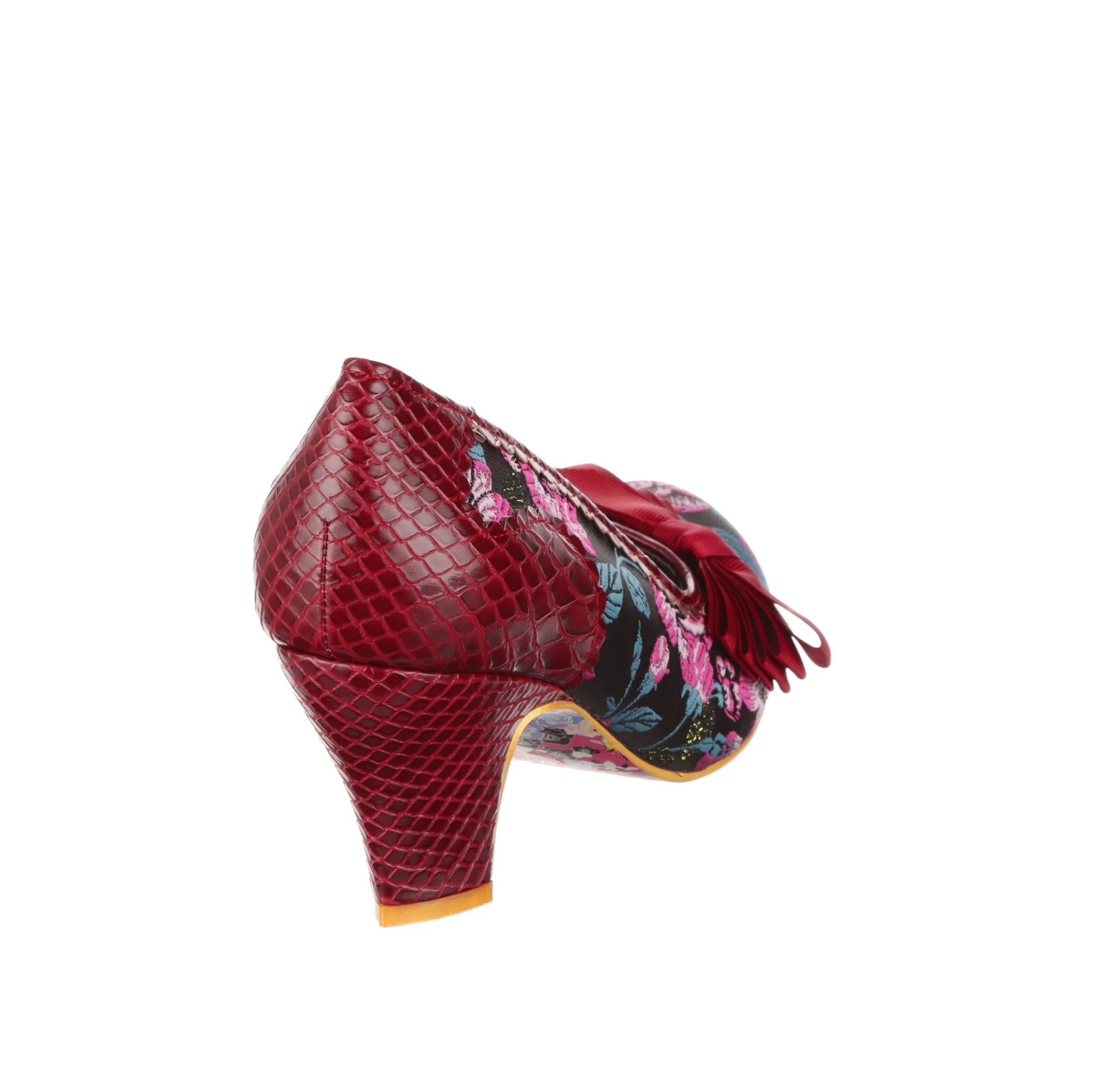 Add a dash of richness to your wardrobe with these fancy red floral mid heels! A luxe woven brocade fabric, patterened with pretty pink blossoms, is trimmed with a deep red snake print heel, scalloped edging and matching scarlet grosgrain bow. These comfy mid heeled courts will make you feel rich, rich, rich! wherever you are.