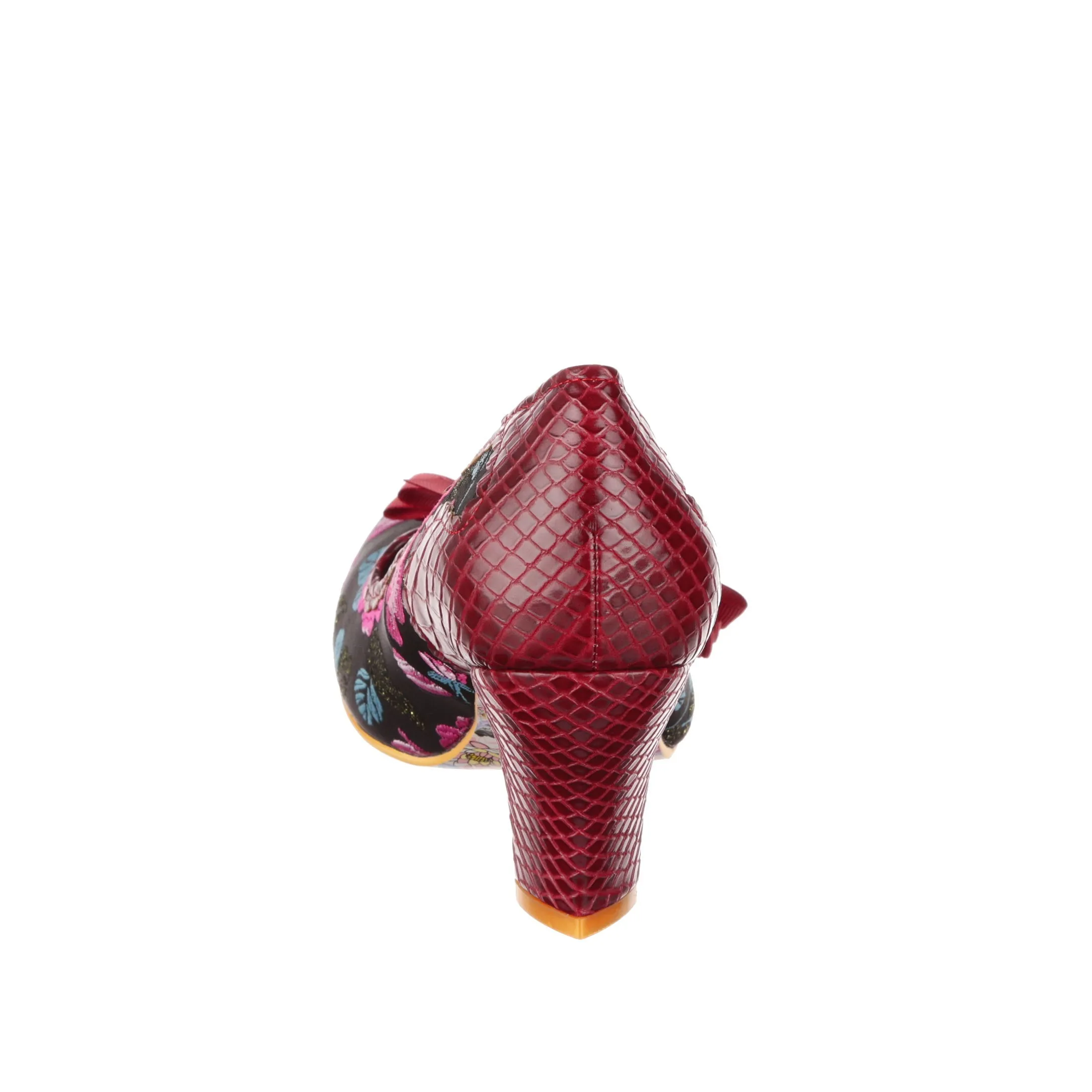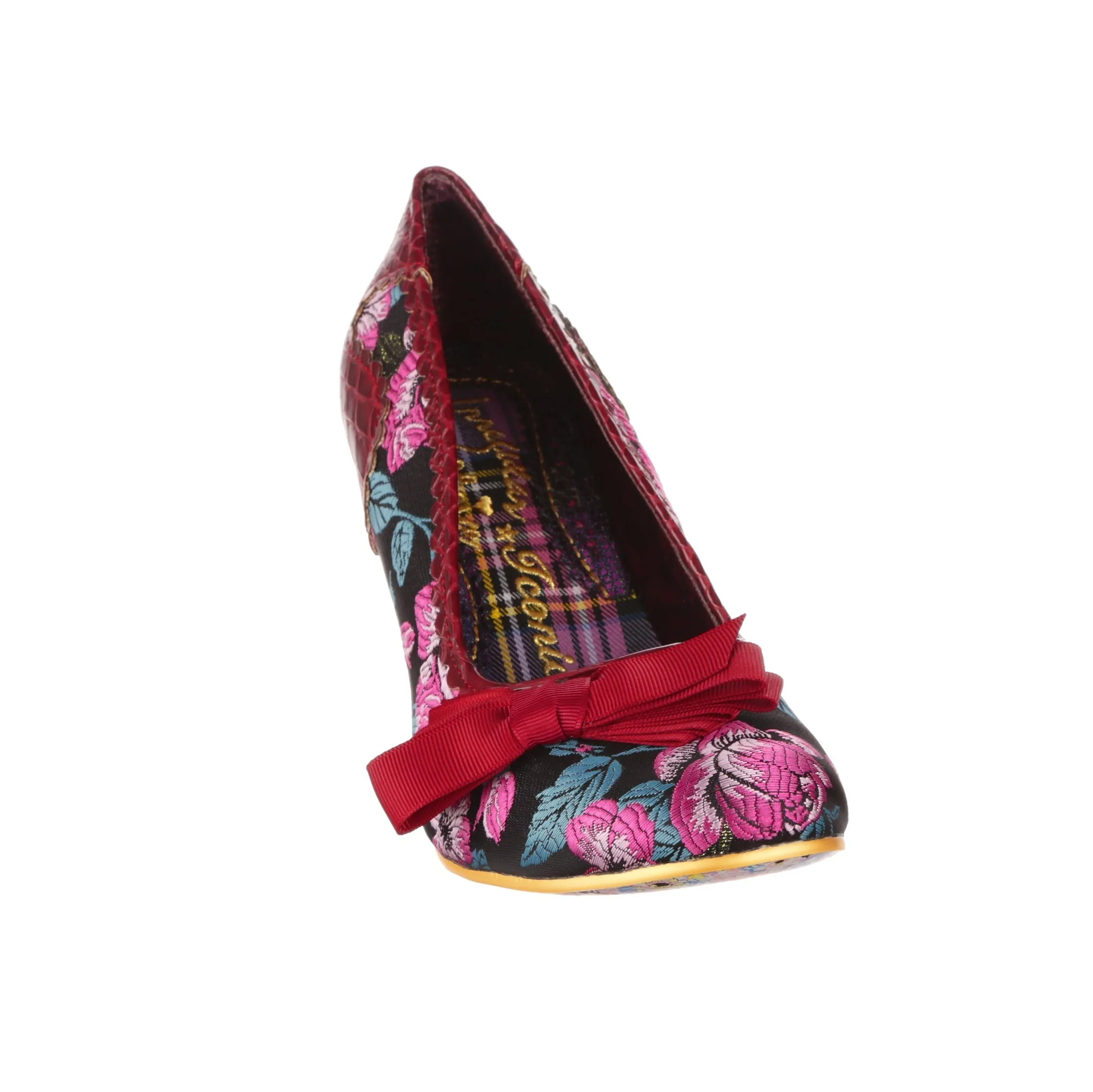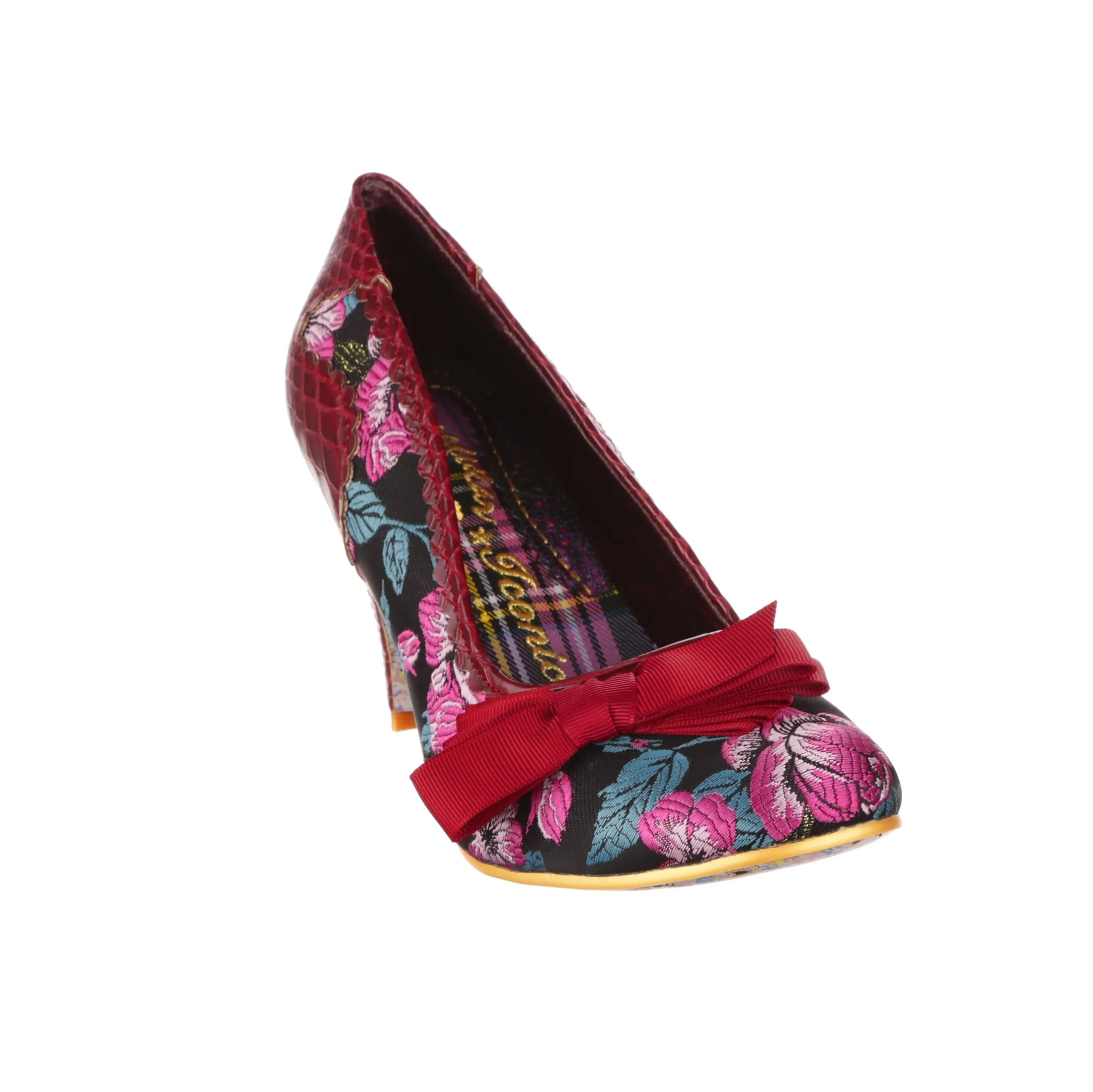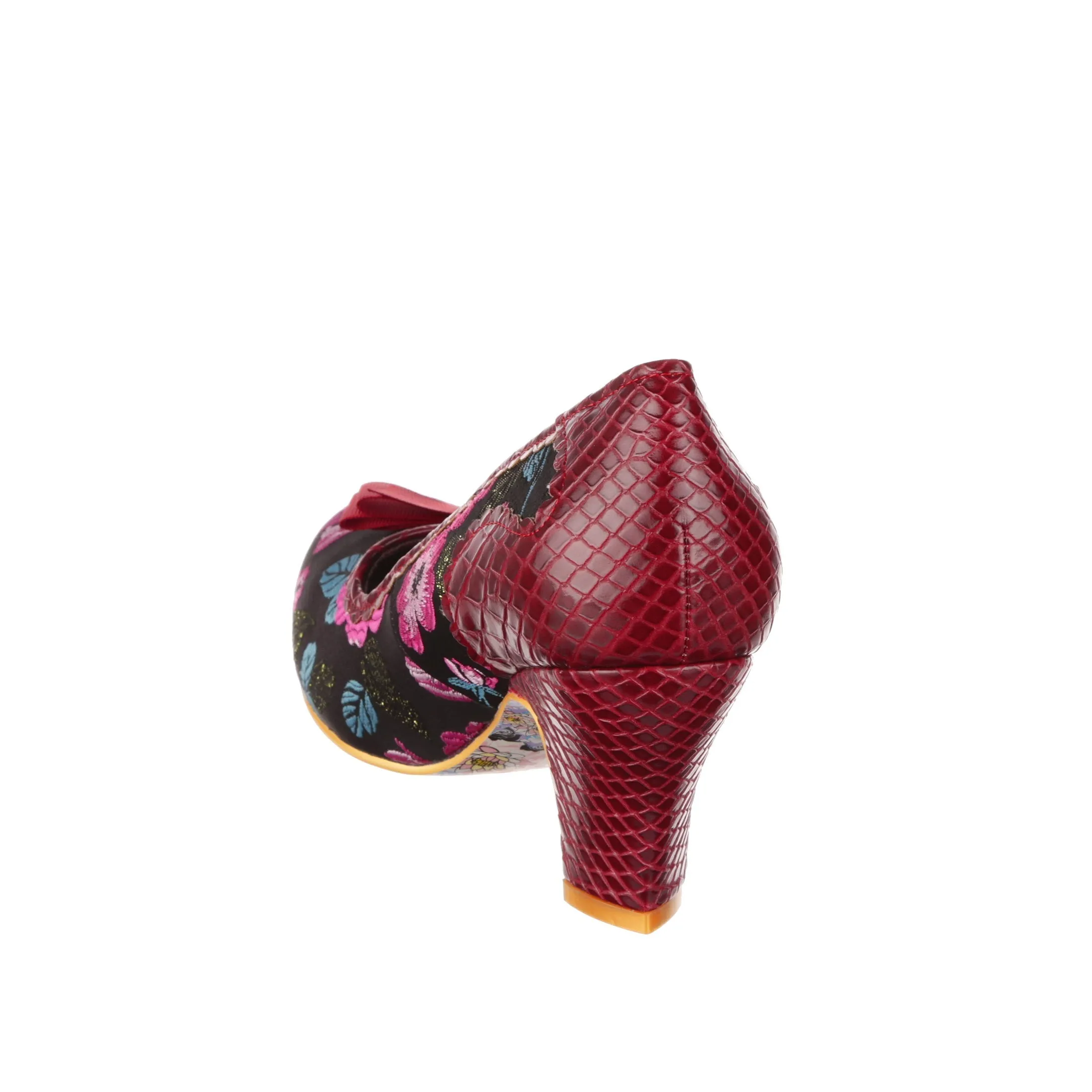 Add a dash of richness to your wardrobe with these fancy red floral mid heels! A luxe woven brocade fabric, patterened with pretty pink blossoms, is trimmed with a deep red snake print heel, scalloped edging and matching scarlet grosgrain bow. These comfy mid heeled courts will make you feel rich, rich, rich! wherever you are.
