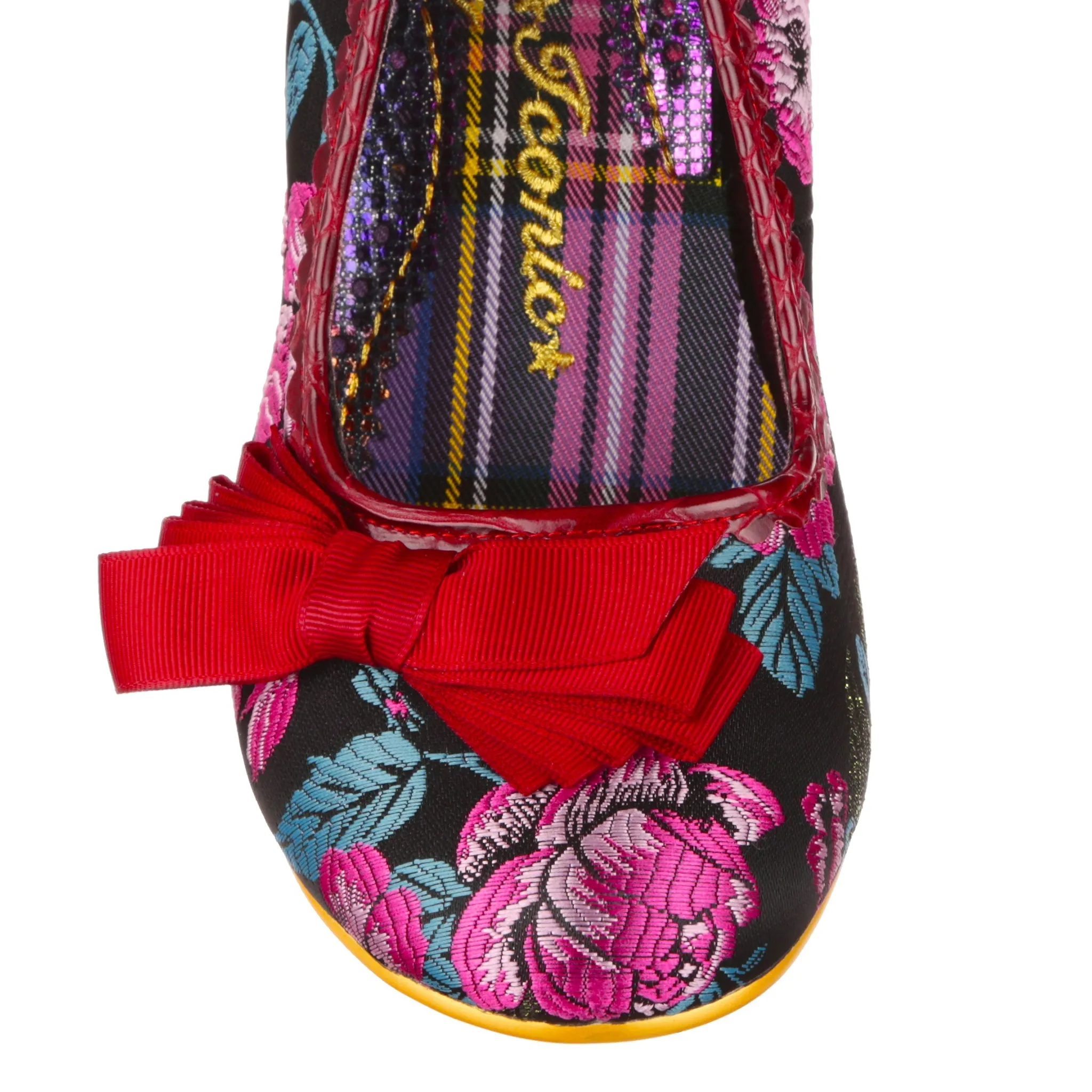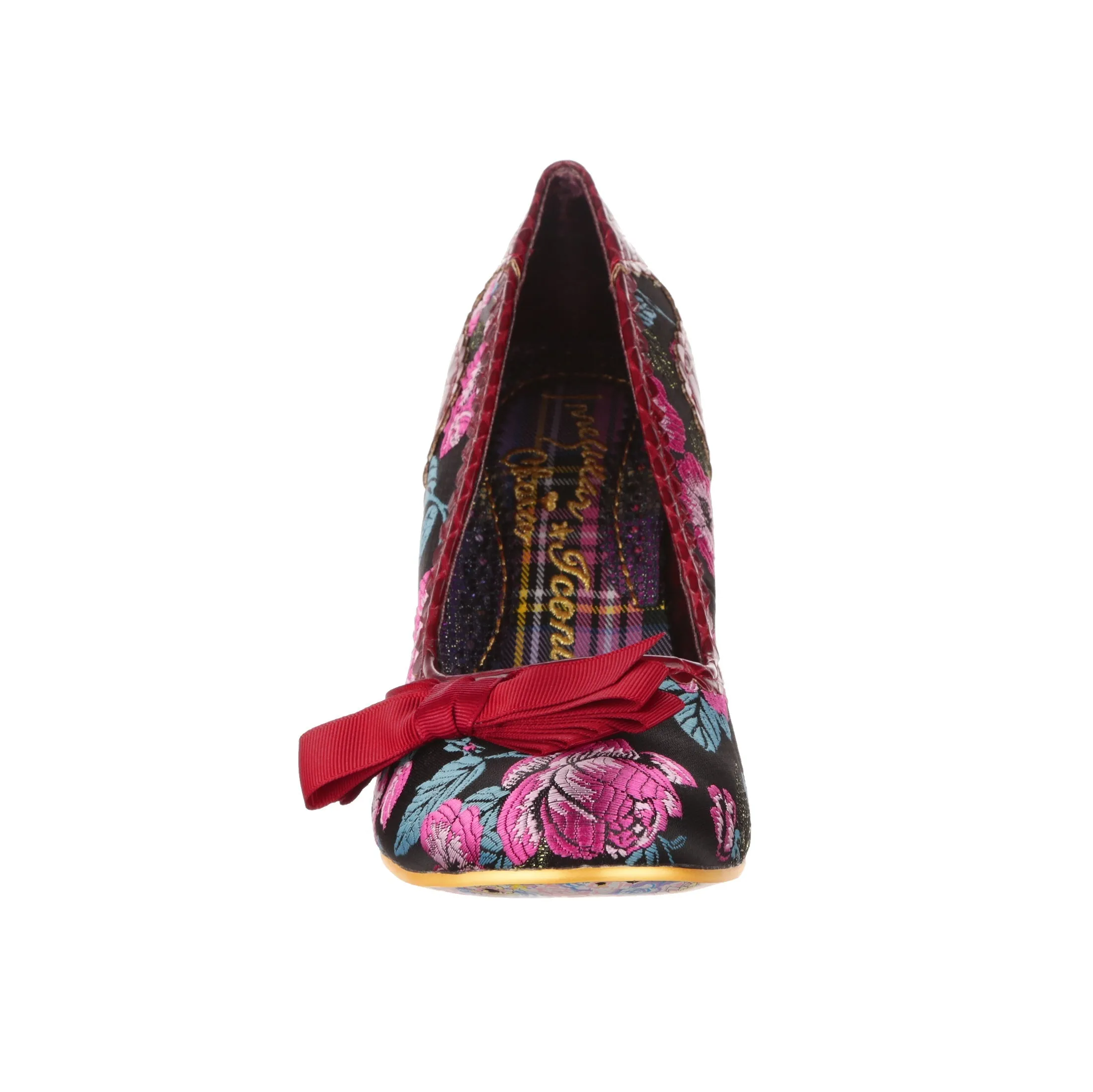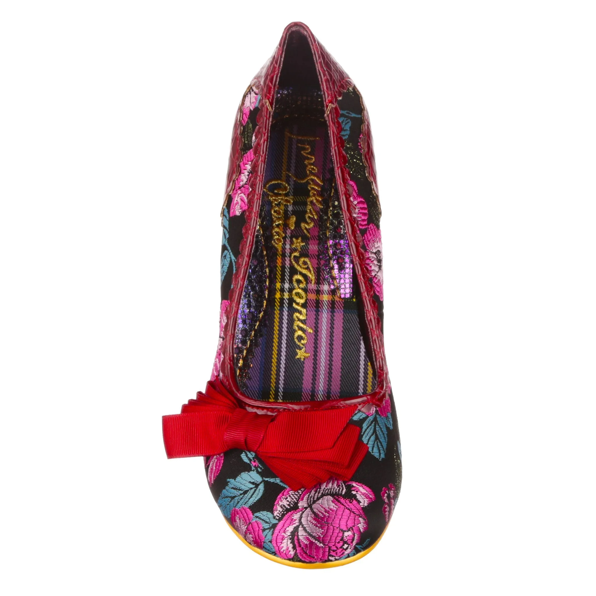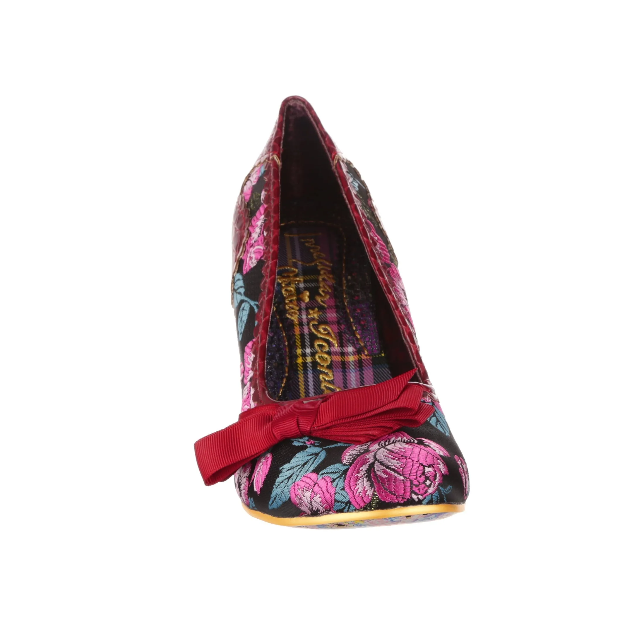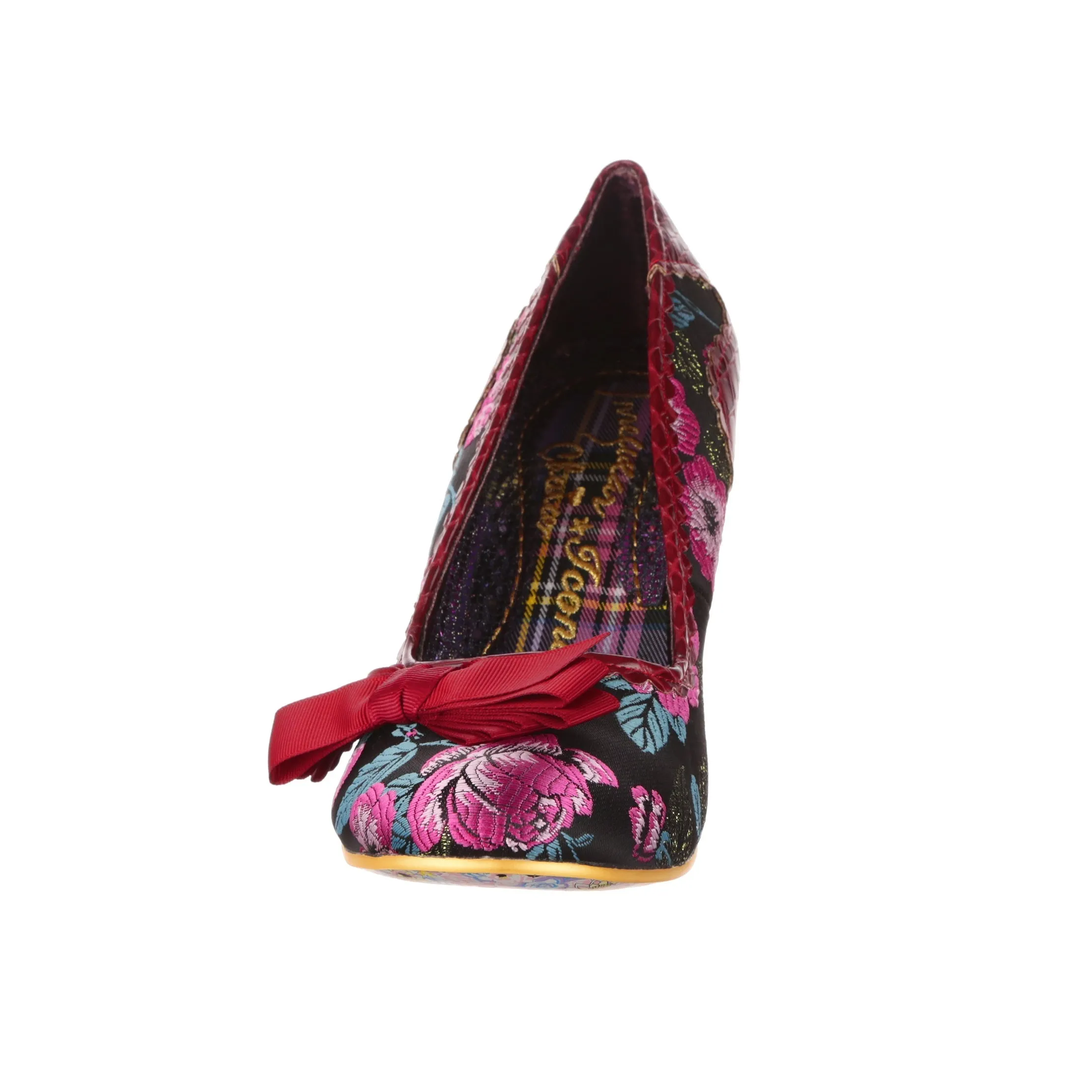 Add a dash of richness to your wardrobe with these fancy red floral mid heels! A luxe woven brocade fabric, patterened with pretty pink blossoms, is trimmed with a deep red snake print heel, scalloped edging and matching scarlet grosgrain bow. These comfy mid heeled courts will make you feel rich, rich, rich! wherever you are.