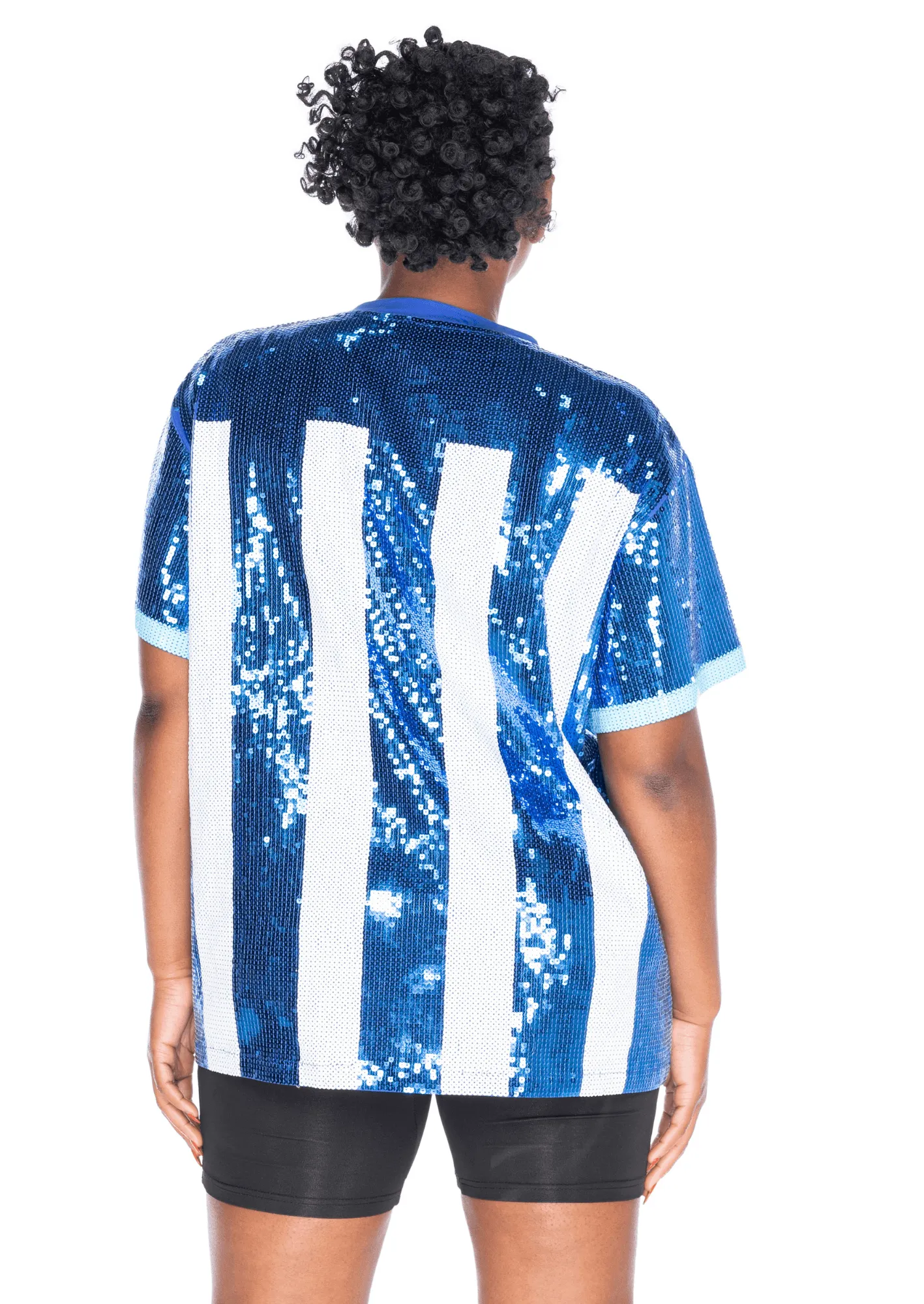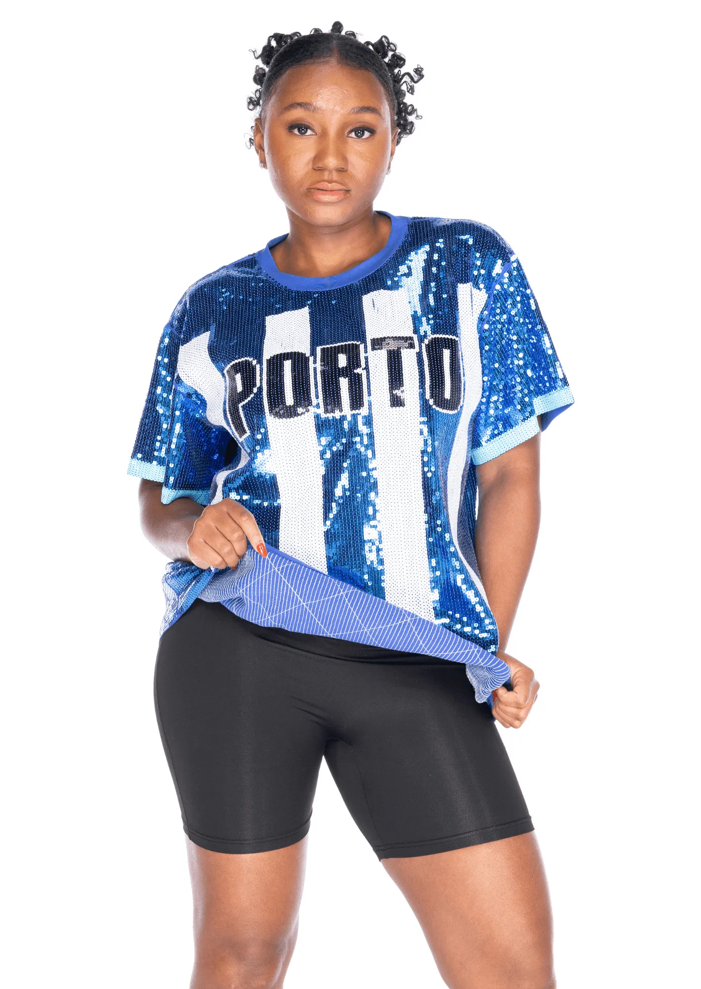 Designed by the Sequin Fans brand, this stunning Portofino soccer Sequin Jersey Shirt beautifully showcases your love for the Portofino soccer team. Step into the stadium or into any game day party with confidence and style with this sports glam soccer jersey shirt, perfect for parties that go from day to night.