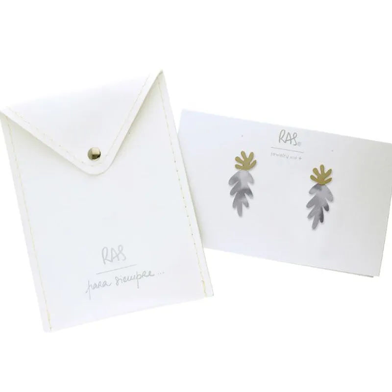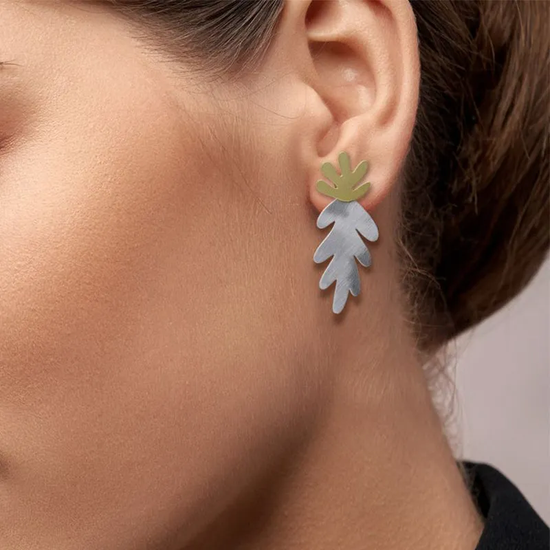 Mixing metals! The Lucia earrings from RAS has gold leaf-like studs with a longer silver leaf drop. Crafted in brass with gold plating and silver plating. We love these playful earrings with a little black dress.