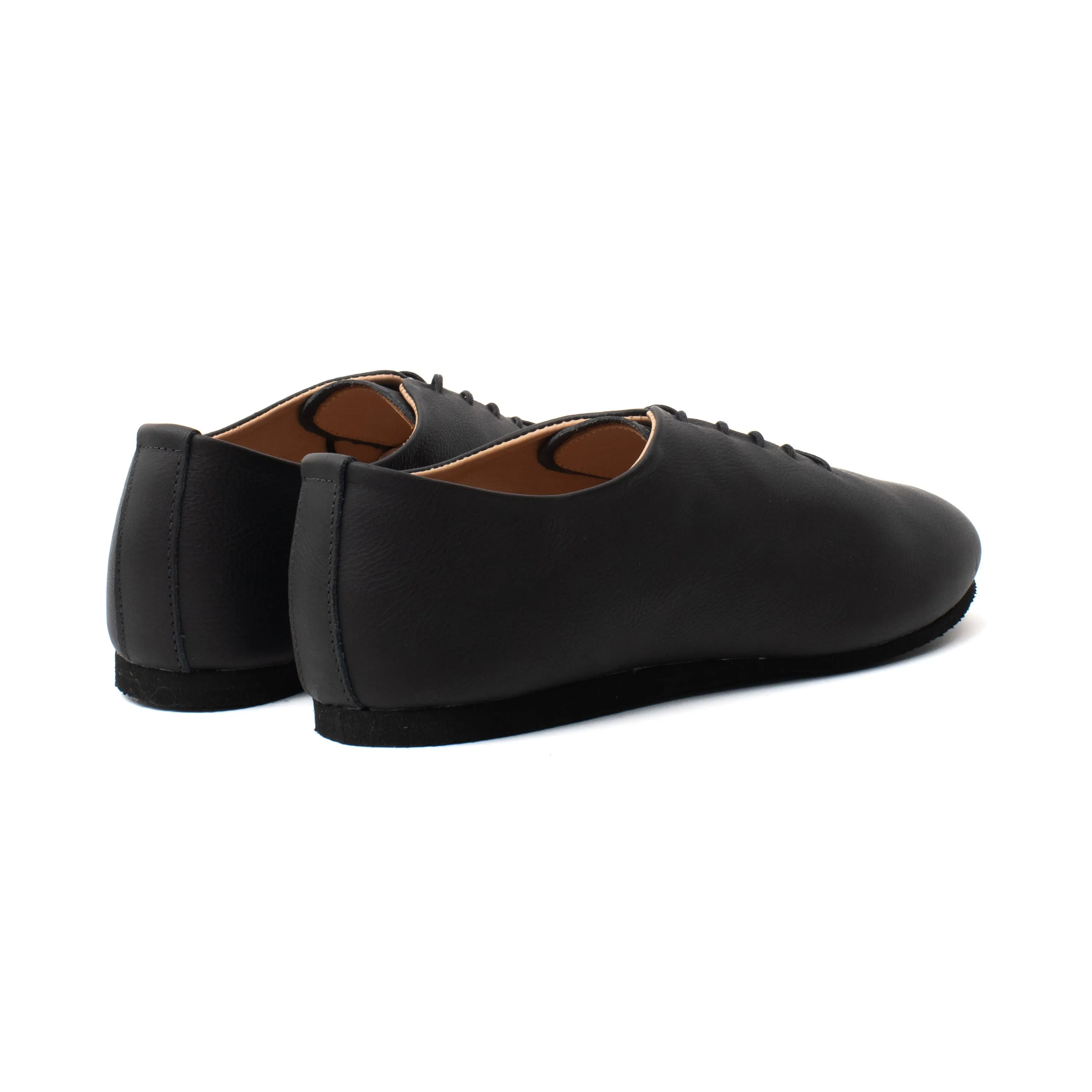 The Regent is a five-eyelet wholecut shoe that also draws inspiration from lightweight jazz and dance shoes. Clean, simple, and versatile, the soft leather moulds to your foot, and the sole flexes with natural movement. The handmade natural leather lined upper sits atop a custom-cut Vibram sole unit in a choice of black, white, or gum colour, which are able to be resoled at our Northampton factory if required at a later date. Between the insole and outsole, the shoe features a layer of cork filling which is usually only found in high-quality, hand-made dress shoes. This process acts in a similar way to memory foam, adding comfort and support as your foot gradually beds into the shoe, leaving a subtle and lasting personal imprint of the wearer's feet. This unisex style can be worn with several different smart or casual outfits and the lightweight feel makes this a perfect everyday or travel shoe. Signed off with handwritten internal style notes, our entire Jazz Collection is handmade to order at our factory in Northampton, England.