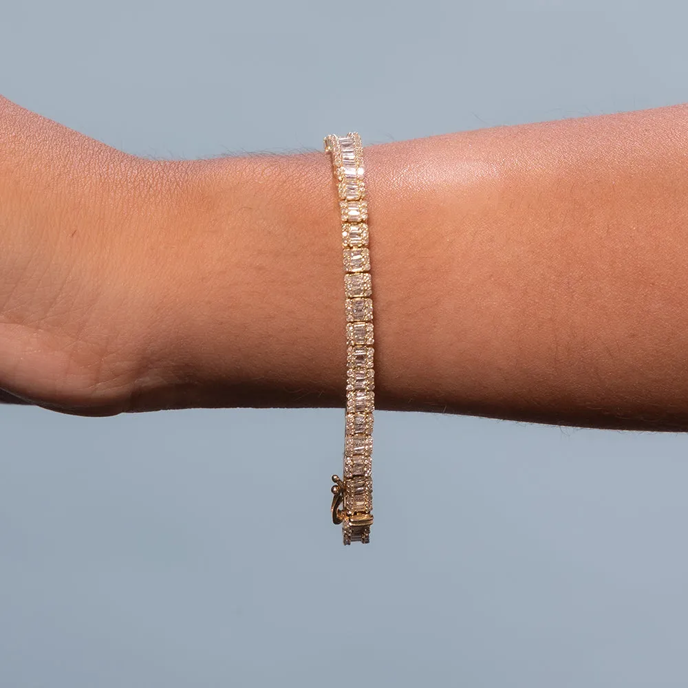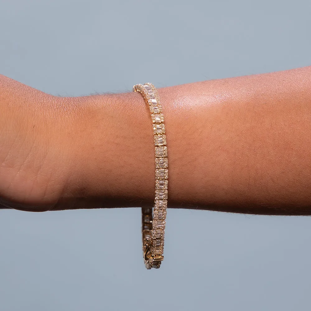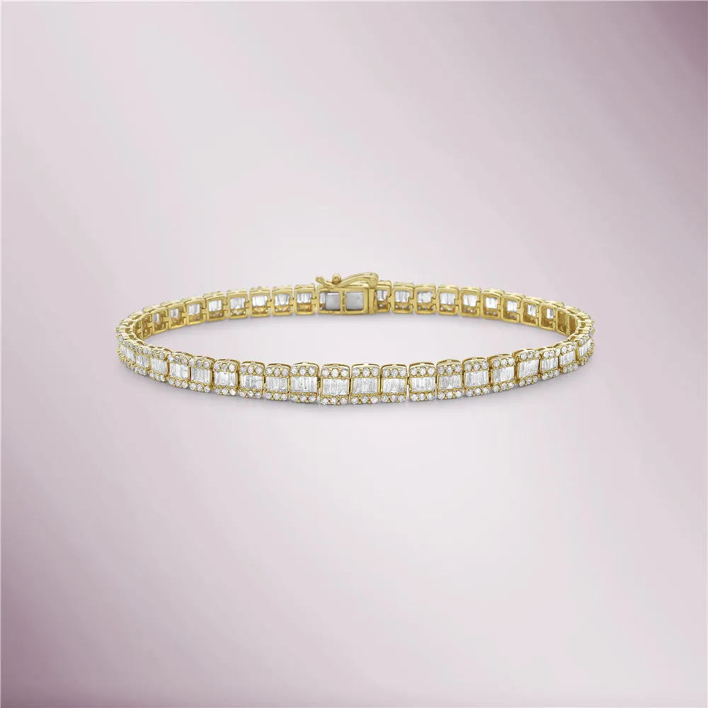 The bracelet features a delicate chain adorned with a sequence of rectangular-shaped elements, each meticulously embellished with a combination of round and baguette diamonds. The rectangular shape adds a contemporary touch to the design, while the diamonds provide a brilliant and captivating sparkle.