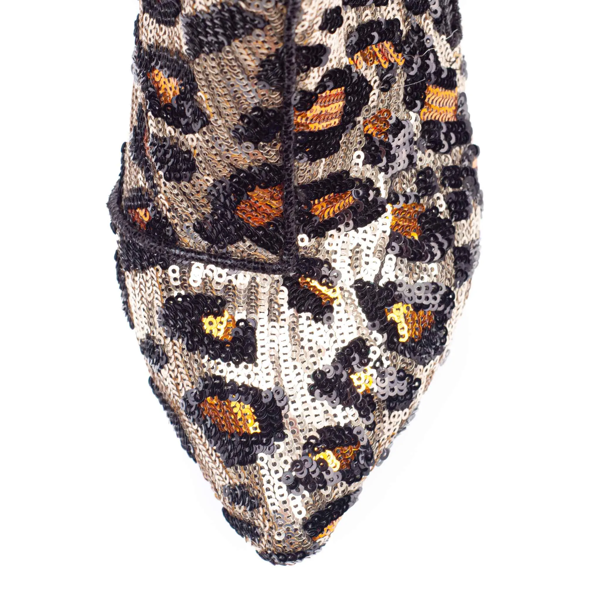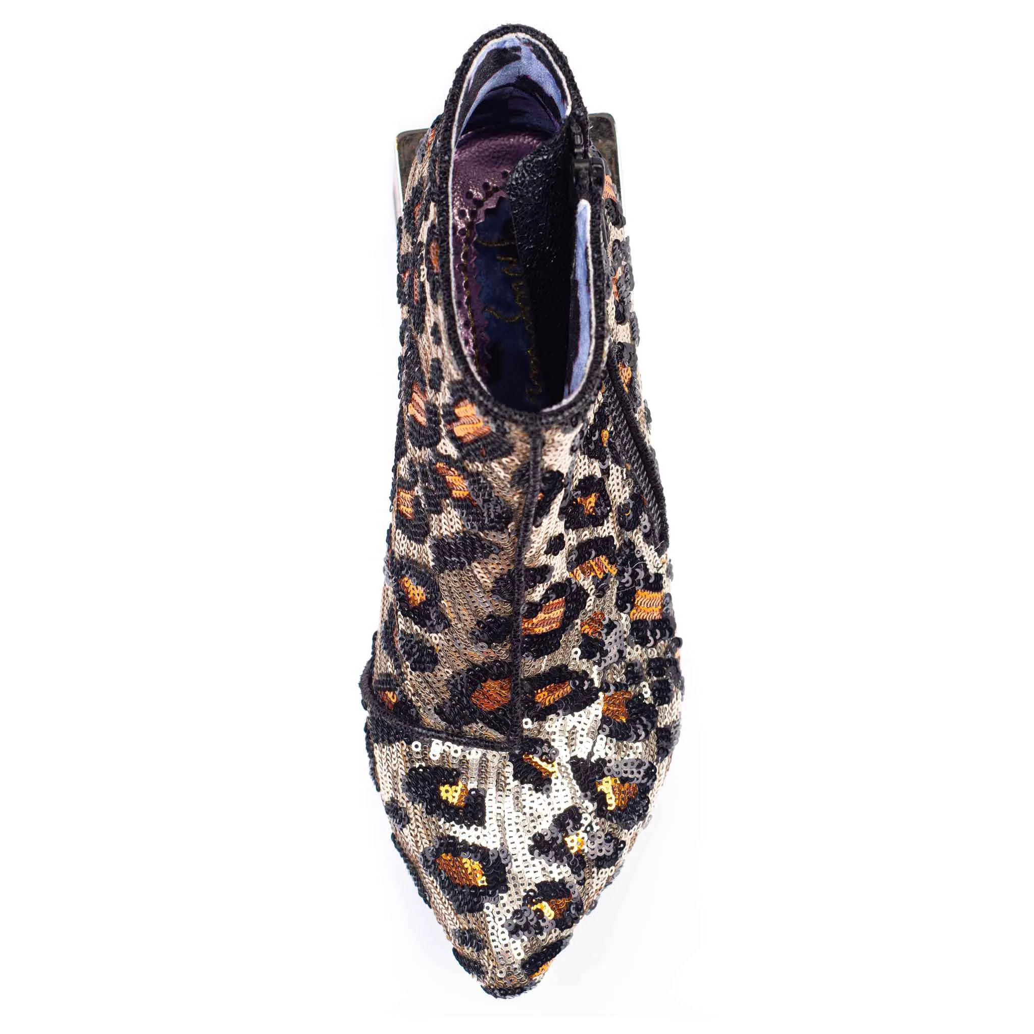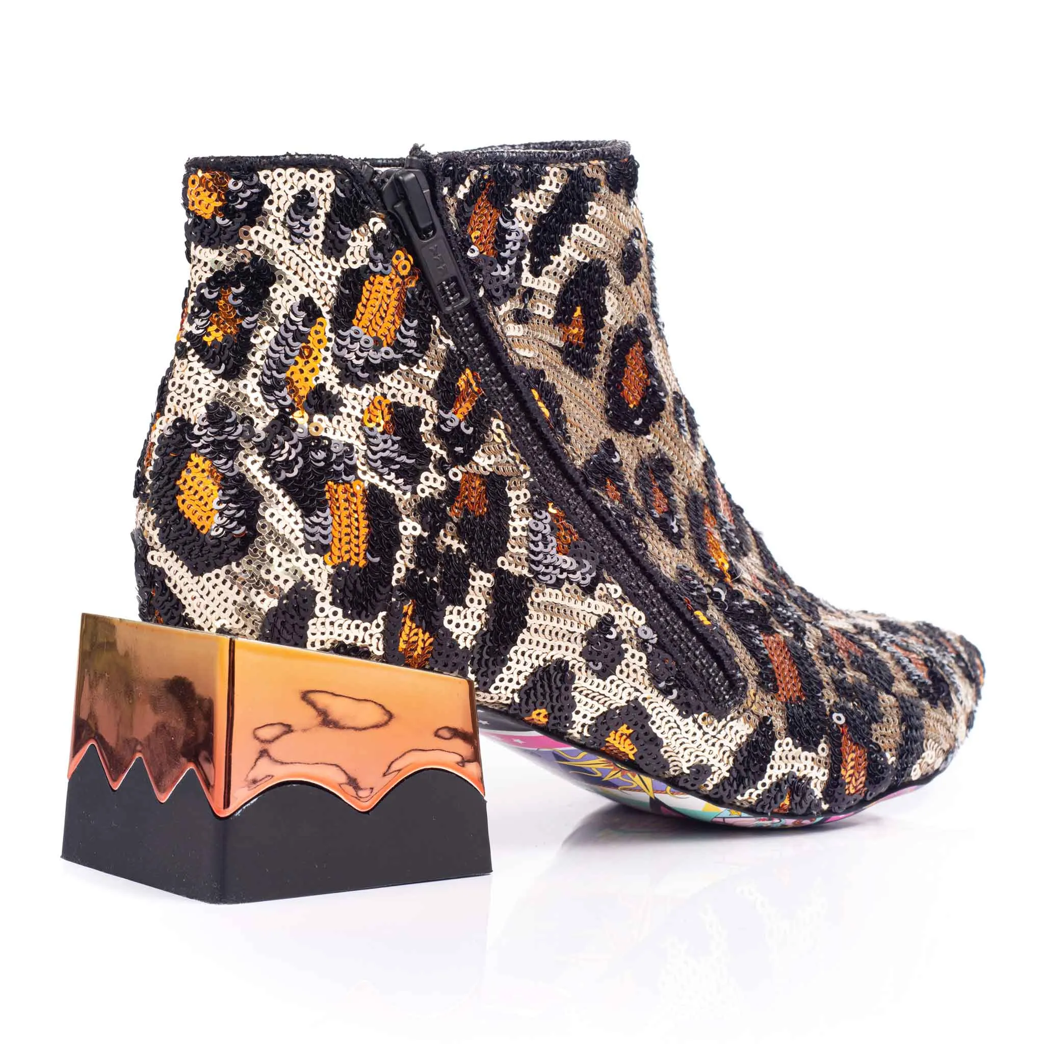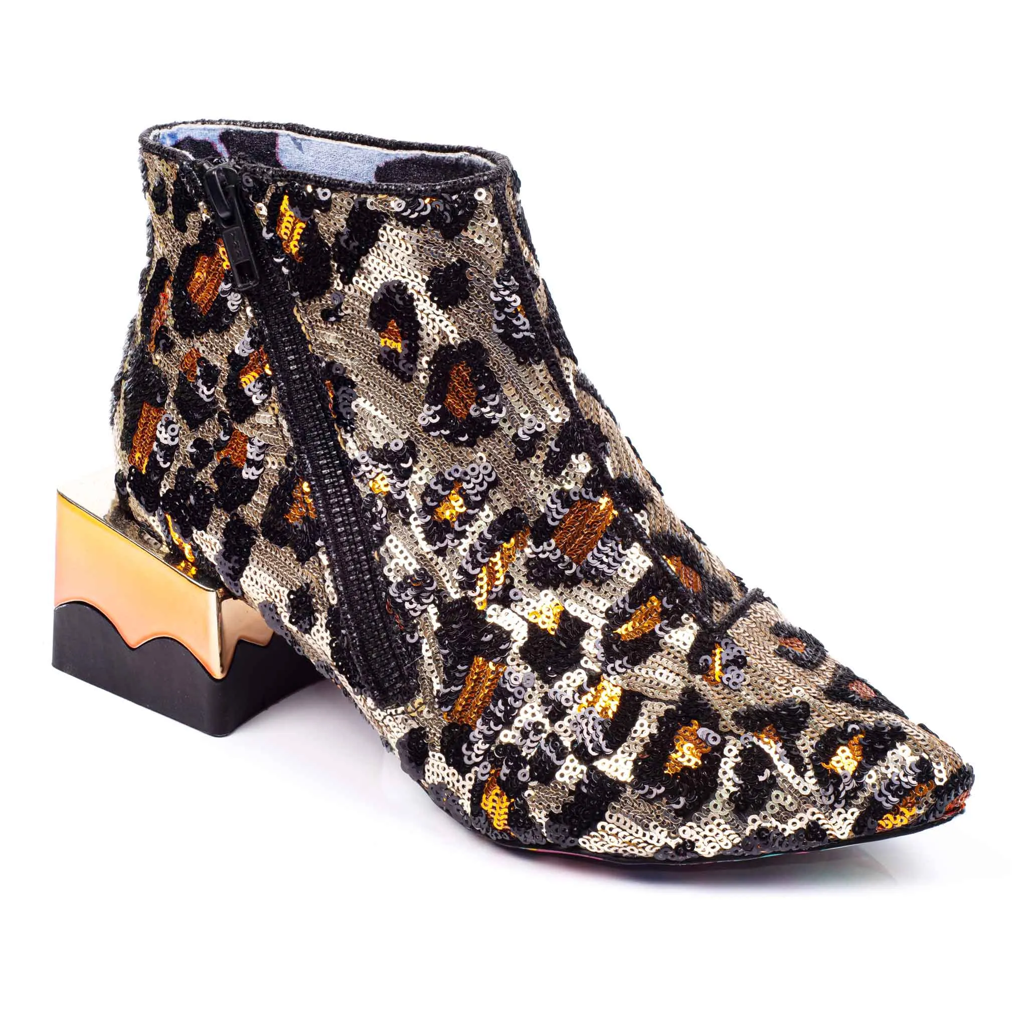 This block rocking ankle boot is anything but square. An eye catching sequinned leopard print upper sits atop an amazing metallic stand out square concept heel! A rare find, we've dug these out of our archives with only 3 available so be quick to bag this pair today!