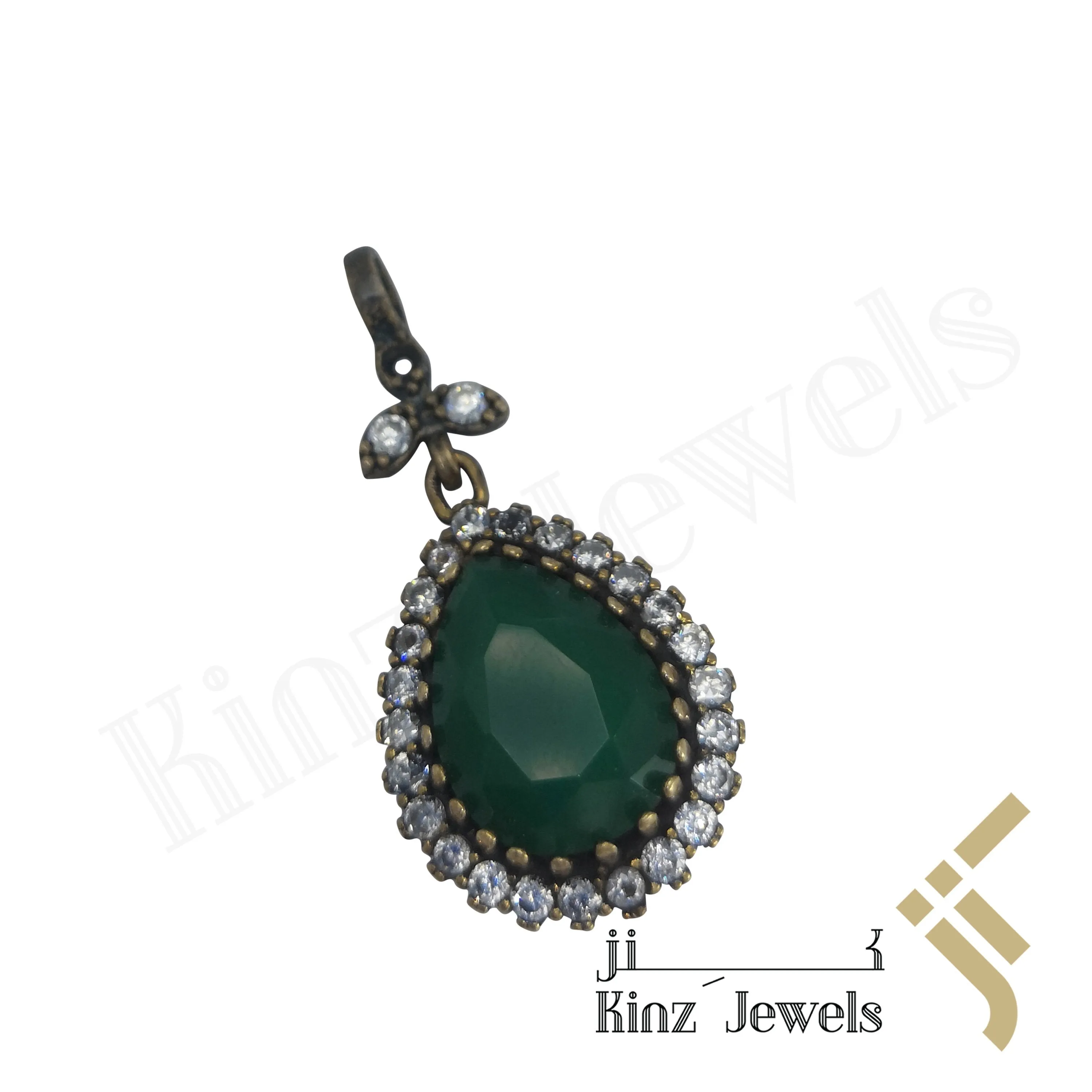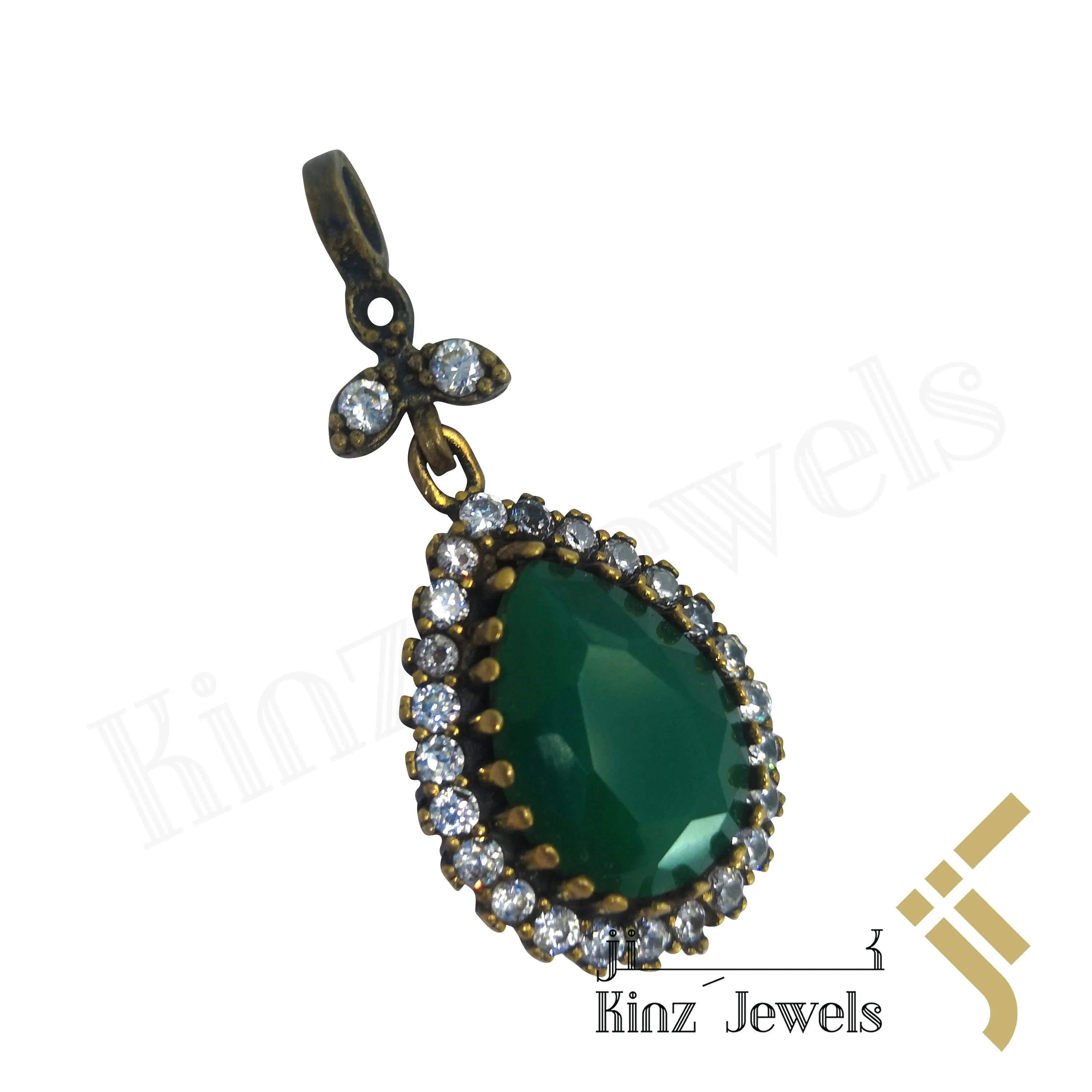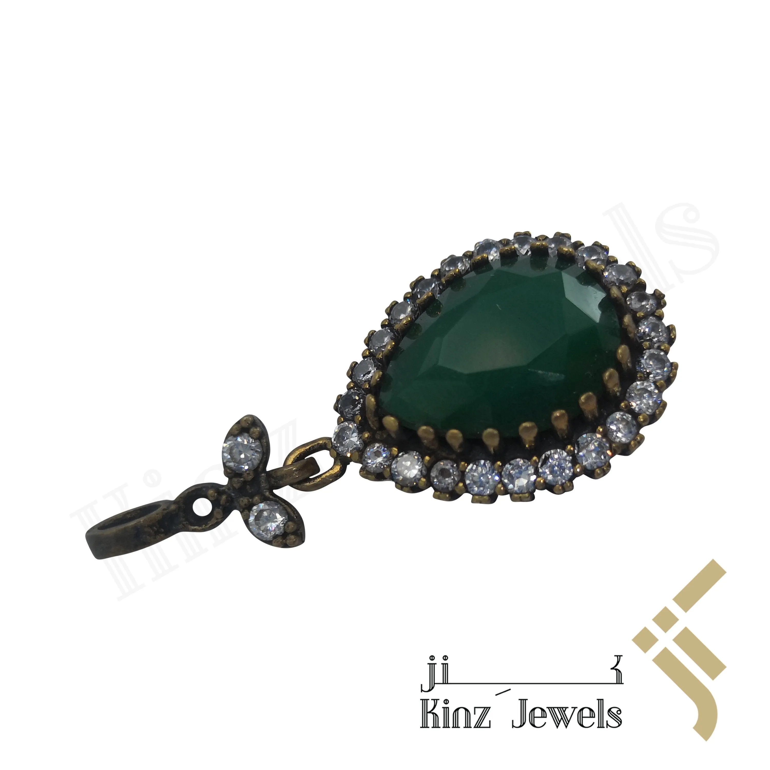 Our Hareem Al Sultan Jewelry Pendant made by 925 sterling silver. Total weight of the Pendant is 6.4 g Mounters are rose color rhodium plated, semi Precious Emerald, White inspired Swarovski Zircon stones ornament as a frame.