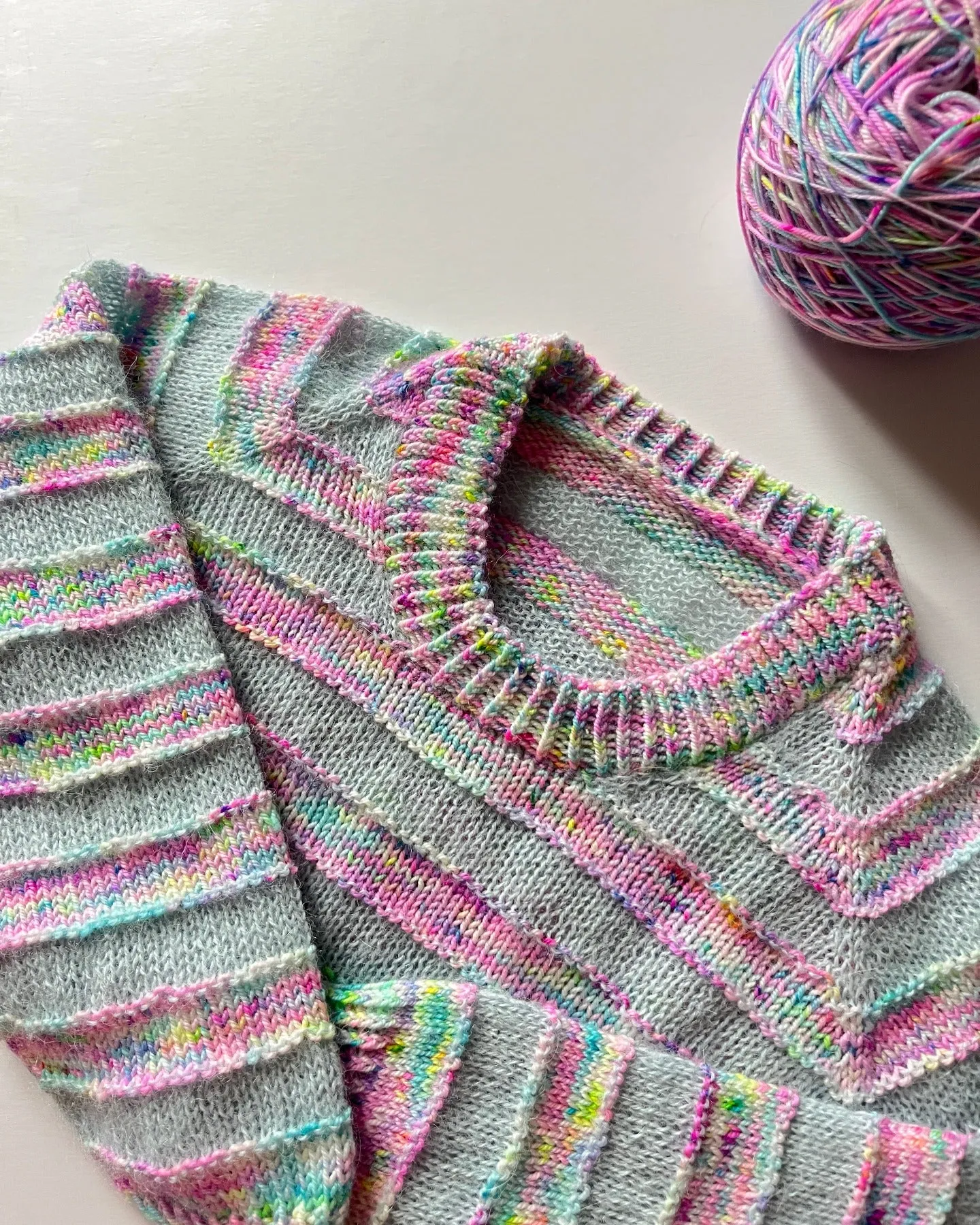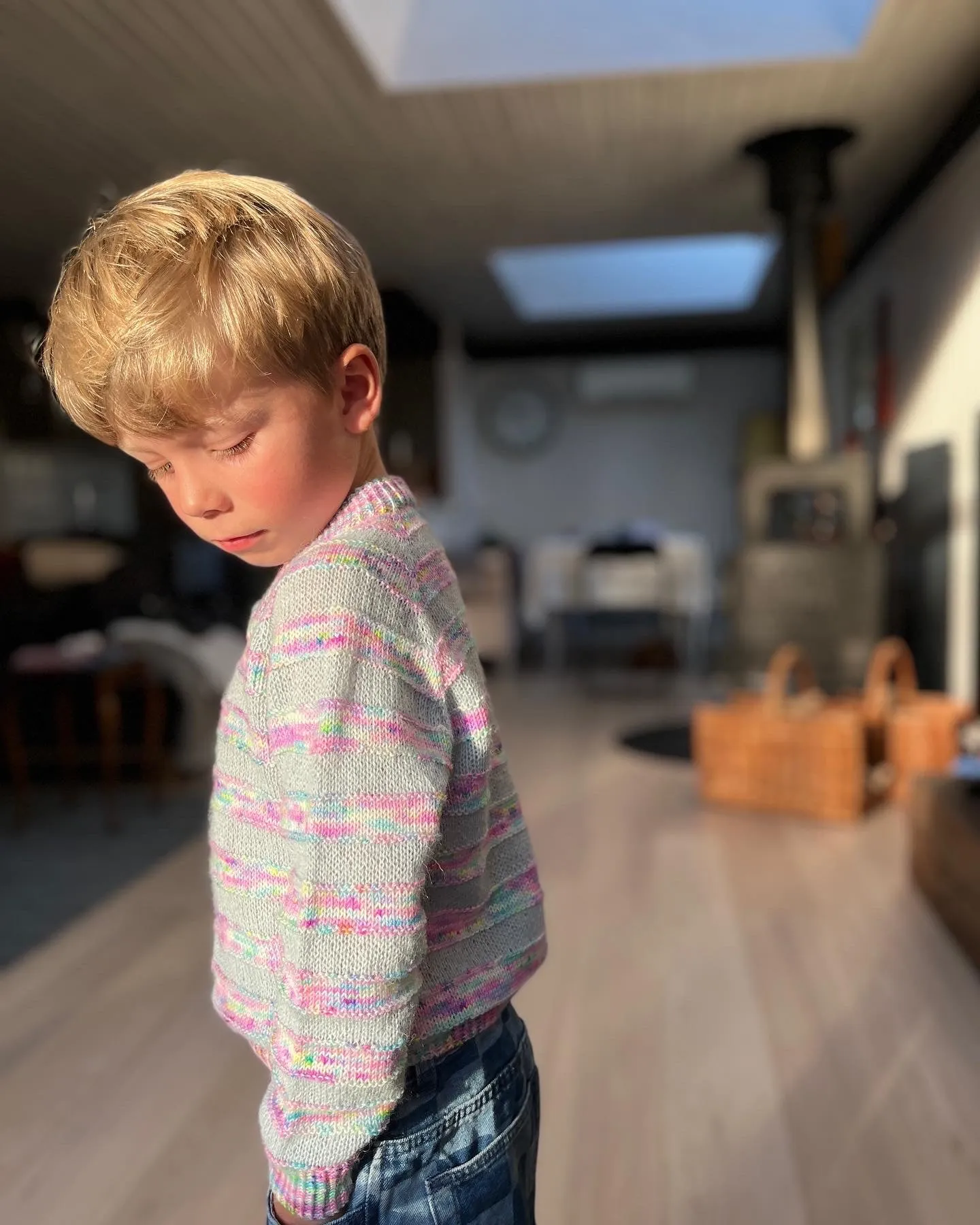 Straight Up Sweater Junior is a raglan sweater with a delicate stripe structure made from alternating between two yarns of different fibres.