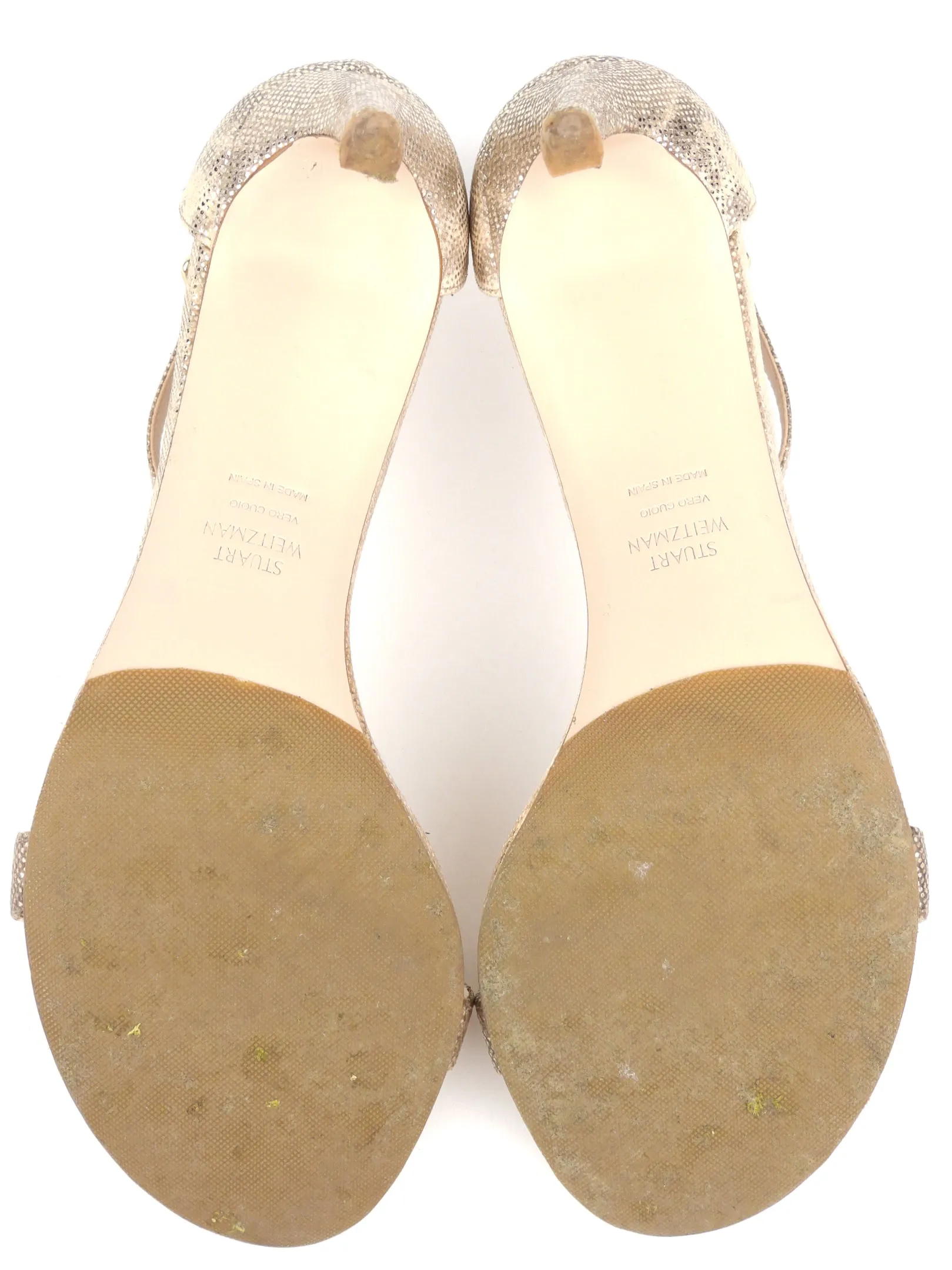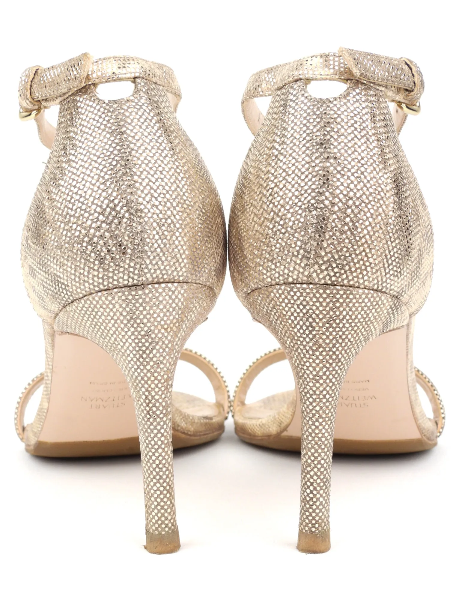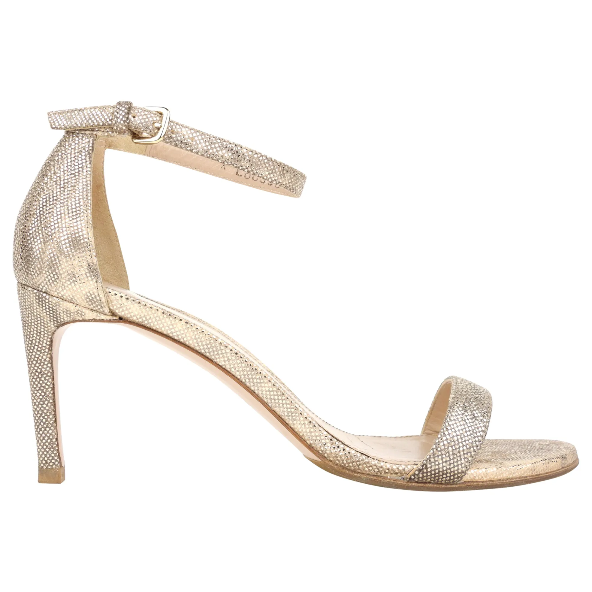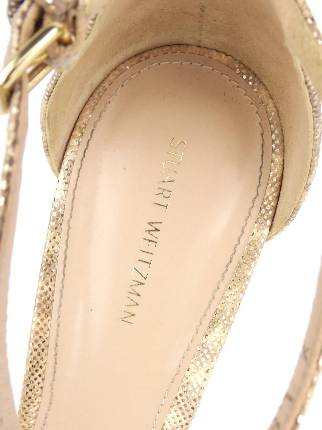 Stuart Weitzman Nearly Nude Desertros Metallic Suede Leather Open Toe Strappy Stiletto Heel Sandals. Original retail $498. Beige and gold-tone metallic textured suede leather upper. Round toe with strap at vamp. Ankle strap with adjustable buckle fastening. Marked size 8.5 US with an 84mm high heel. Excellent previously owned condition with minor signs of wear at soles. Includes box. Without additional packaging.