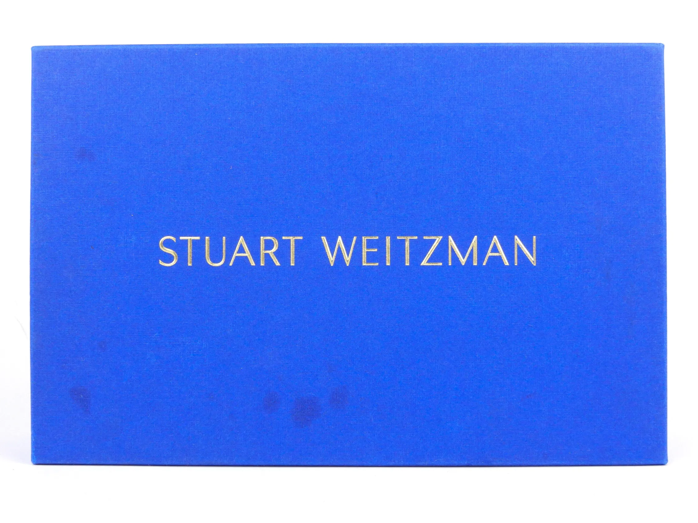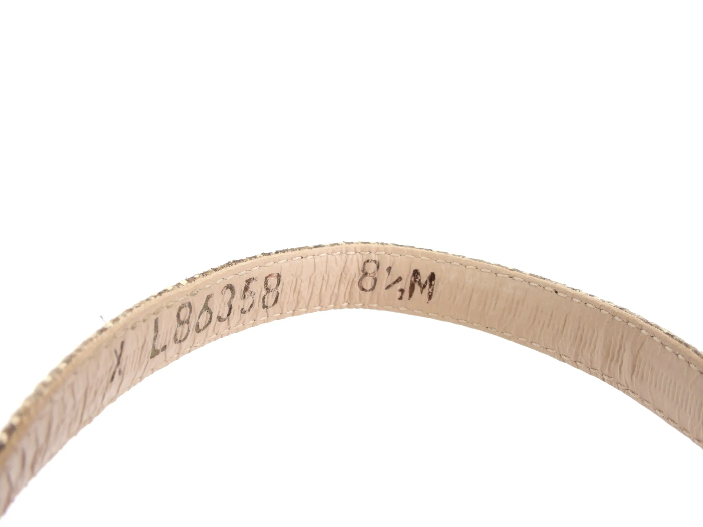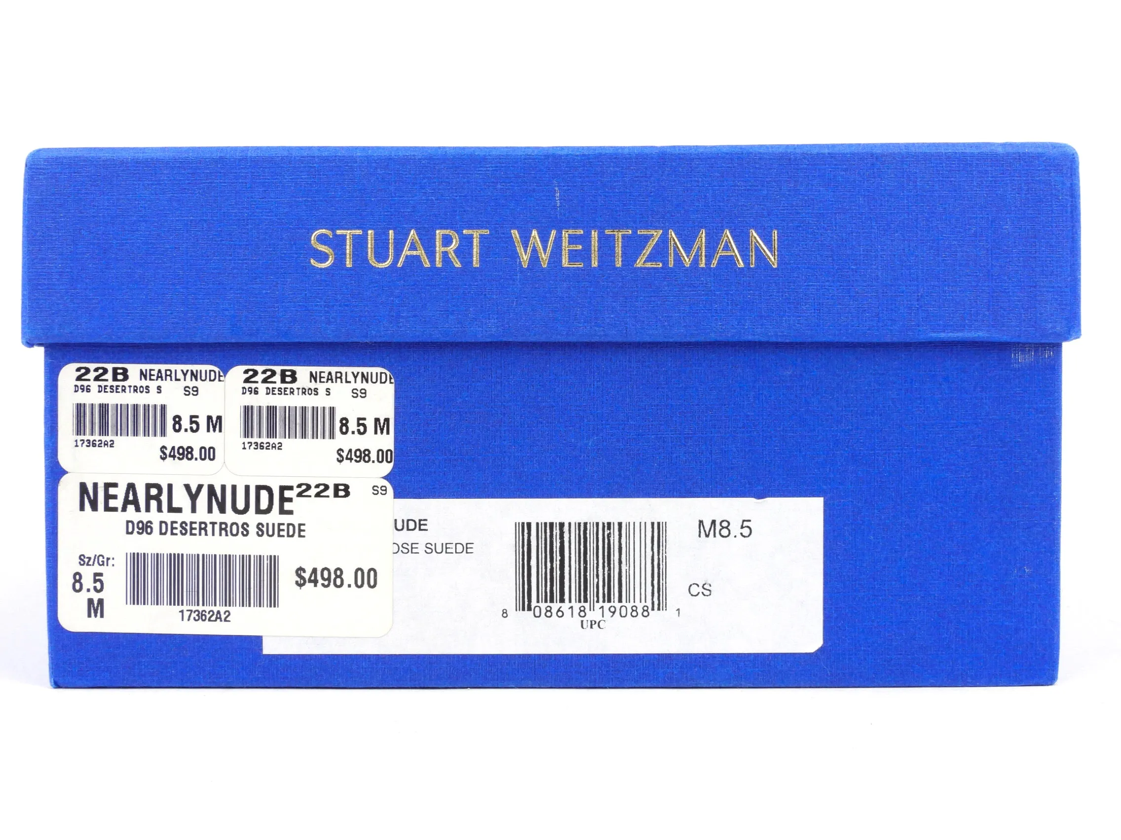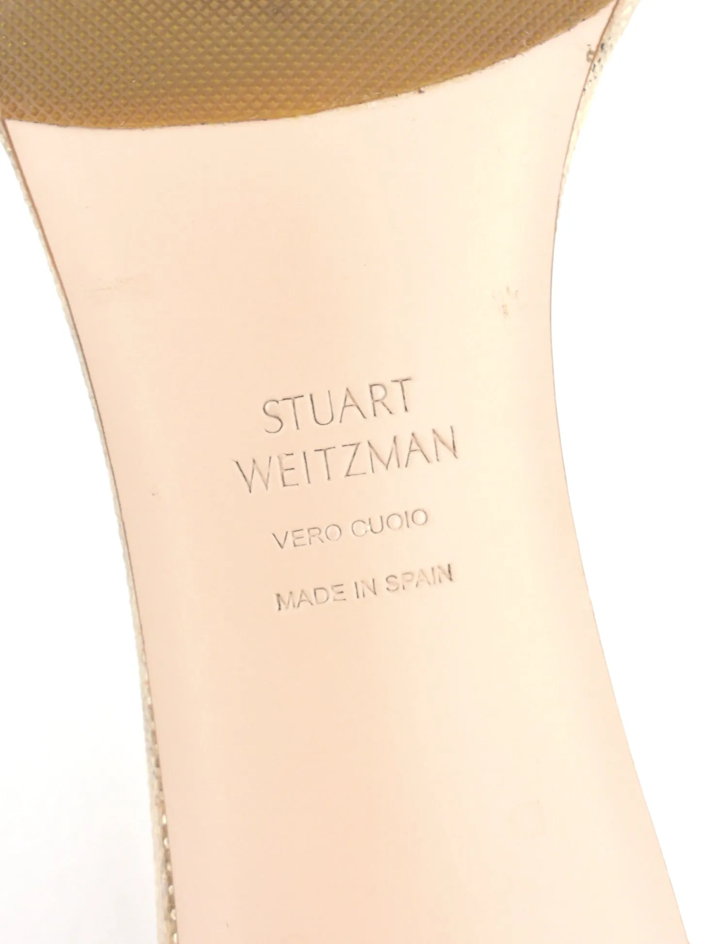 Stuart Weitzman Nearly Nude Desertros Metallic Suede Leather Open Toe Strappy Stiletto Heel Sandals. Original retail $498. Beige and gold-tone metallic textured suede leather upper. Round toe with strap at vamp. Ankle strap with adjustable buckle fastening. Marked size 8.5 US with an 84mm high heel. Excellent previously owned condition with minor signs of wear at soles. Includes box. Without additional packaging.